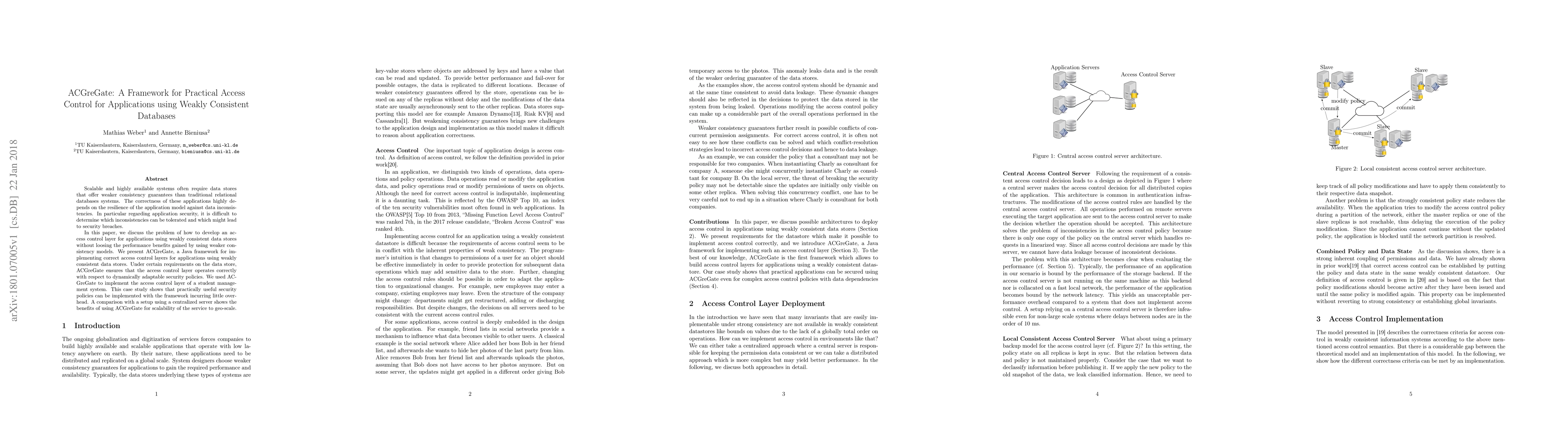 This paper introduces ACGreGate, a Java framework designed to implement access control for applications utilizing weakly consistent databases, ensuring security without sacrificing performance. The framework enables dynamically adaptable security policies and was demonstrated through a student management system, showing scalability benefits compared to centralized server-based setups.