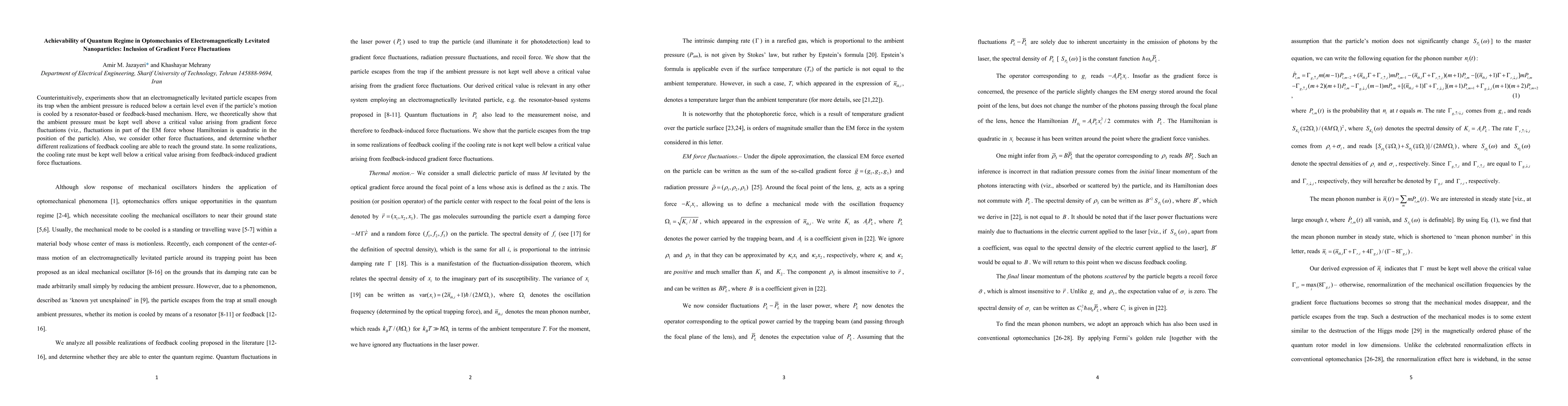 Counterintuitively, experiments show that an electromagnetically levitated particle escapes from its trap when the ambient pressure is reduced below a certain level even if the particle's motion is cooled by a resonator-based or feedback-based mechanism. Here, we theoretically show that the ambient pressure must be kept well above a critical value arising from gradient force fluctuations (viz., fluctuations in part of the EM force whose Hamiltonian is quadratic in the position of the particle). Also, we consider other force fluctuations, and determine whether different realizations of feedback cooling are able to reach the ground state. In some realizations, the cooling rate must be kept well below a critical value arising from feedback-induced gradient force fluctuations.