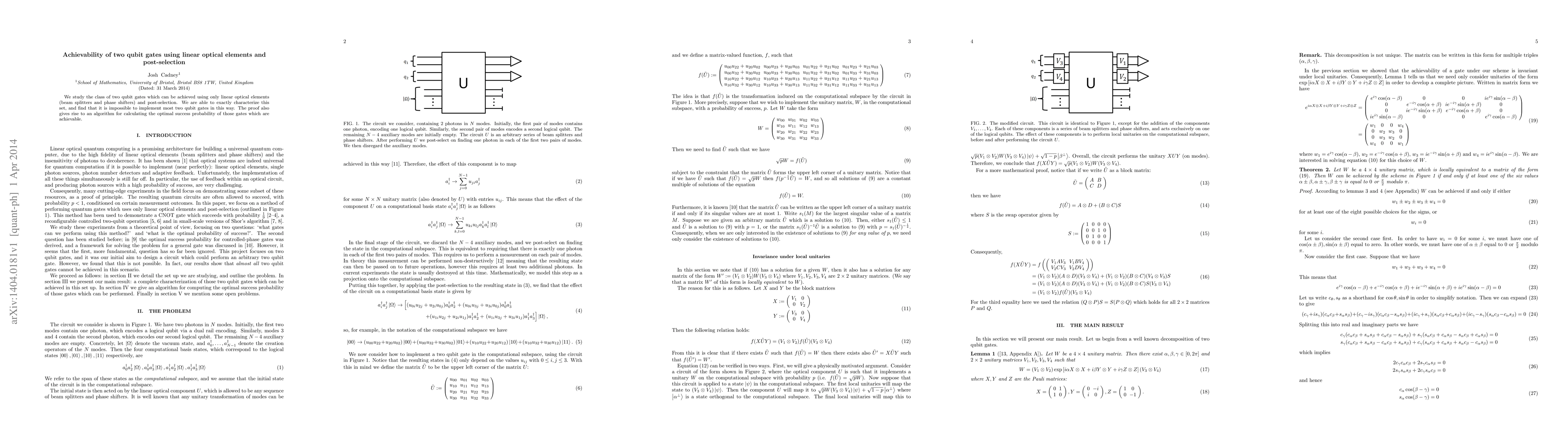This paper characterizes the set of two qubit gates realizable using only linear optical elements and post-selection, concluding that most such gates cannot be implemented. It also provides an algorithm to determine the optimal success probability for the achievable gates.