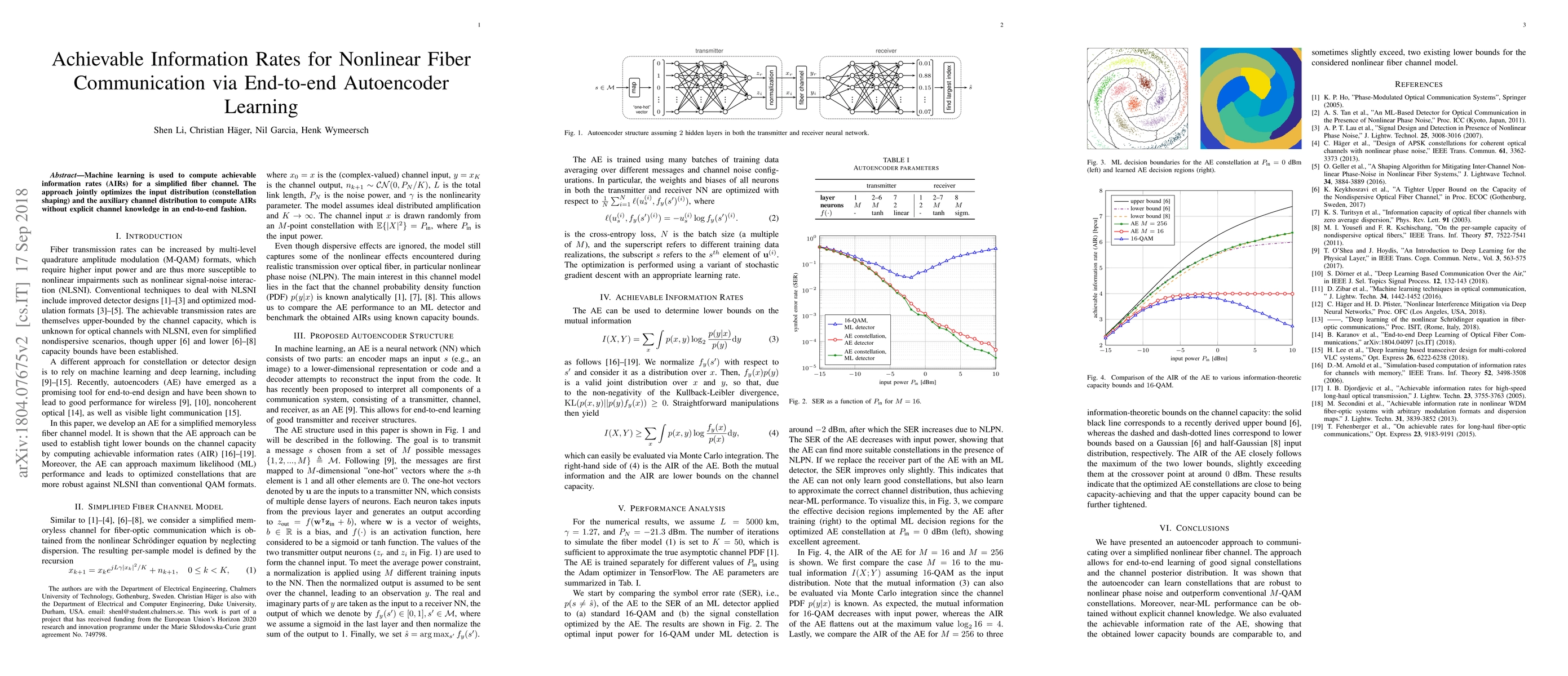 Machine learning is used to compute achievable information rates (AIRs) for a simplified fiber channel. The approach jointly optimizes the input distribution (constellation shaping) and the auxiliary channel distribution to compute AIRs without explicit channel knowledge in an end-to-end fashion.