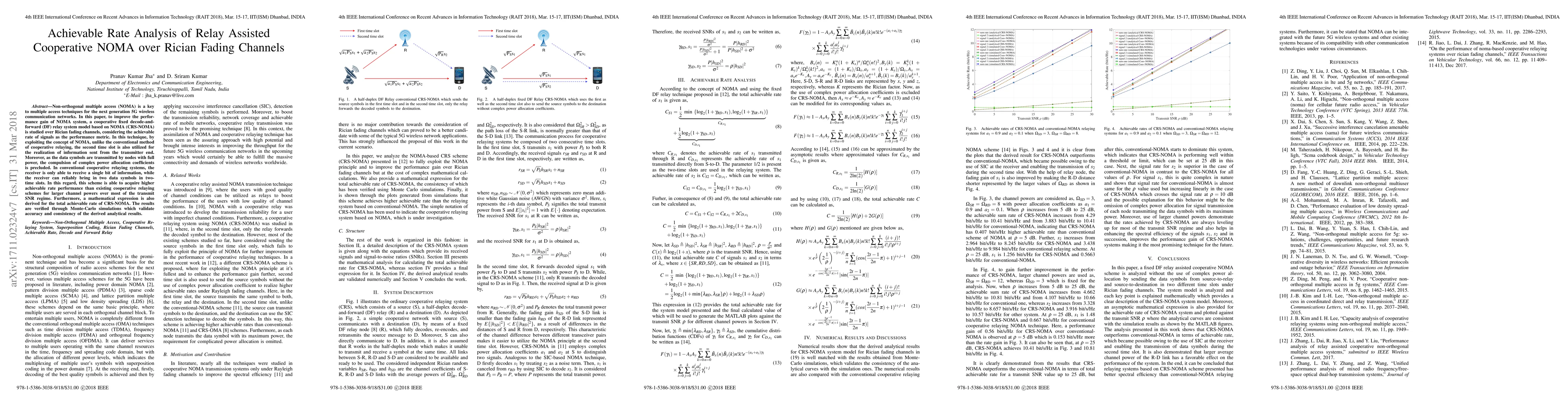 This paper investigates a cooperative relay-assisted NOMA system over Rician fading channels, demonstrating improved achievable rate performance compared to conventional relaying methods. The proposed CRS-NOMA scheme leverages full power transmission and dual-time slot information relaying, achieving higher rates without complex power allocation.
