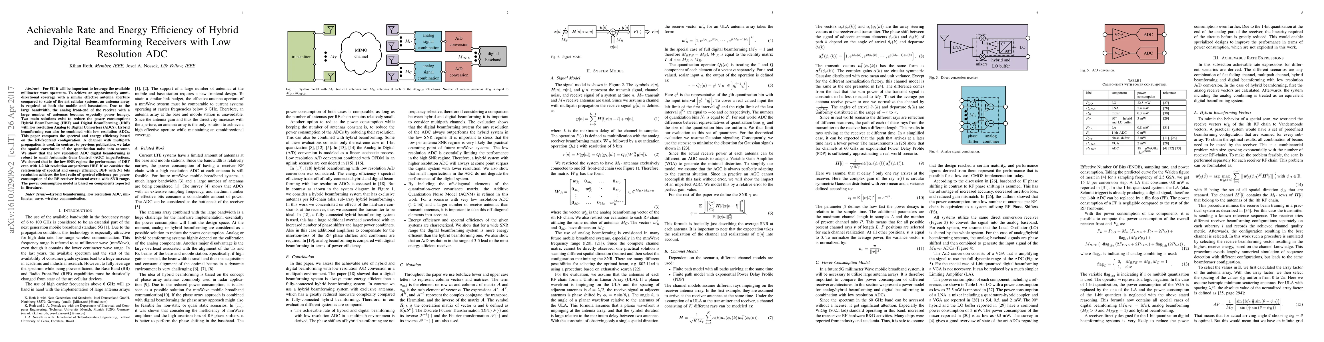 For 5G it will be important to leverage the available millimeter wave spectrum. To achieve an approximately omni- directional coverage with a similar effective antenna aperture compared to state of the art cellular systems, an antenna array is required at both the mobile and basestation. Due to the large bandwidth and inefficient amplifiers available in CMOS for mmWave, the analog front-end of the receiver with a large number of antennas becomes especially power hungry. Two main solutions exist to reduce the power consumption: Hybrid BeamForming (HBF) and Digital BeamForming (DBF) with low resolution ADC. Hybrid beamforming can also be combined with low resolution ADCs. This paper compares the spectral and energy efficiency based on the chosen RF-frontend configuration. A channel with multipath propagation is used. In contrast to previous publication, we take the spatial correlation of the quantization noise into account. We show that the low resolution ADC are robust to small Automatic Gain Control (AGC) imperfections. We showed that in the low SNR regime the performance of DBF even with 1-2 bit resolution outperforms HBF. If we consider the relationship of spectral and energy efficiency then DBF with 3-5 bits resolution achieves the best ratio of spectral efficiency per power consumption of the RF receiver frontend over a very wide SNR region. The power consumption model is based on components reported in literature.