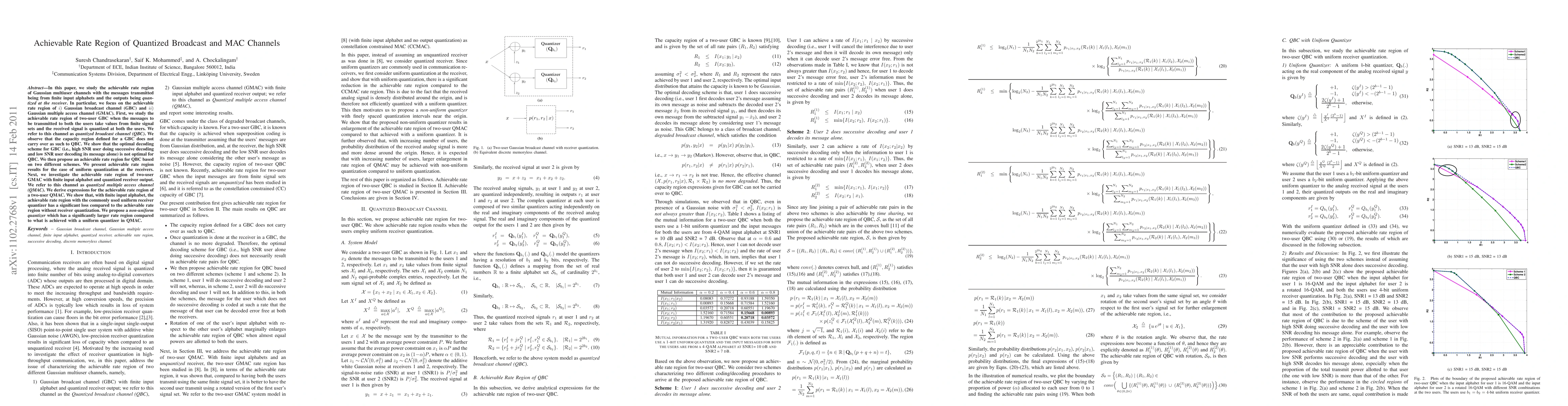In this paper, we study the achievable rate region of Gaussian multiuser channels with the messages transmitted being from finite input alphabets and the outputs being {\em quantized at the receiver}. In particular, we focus on the achievable rate region of $i)$ Gaussian broadcast channel (GBC) and $ii)$ Gaussian multiple access channel (GMAC). First, we study the achievable rate region of two-user GBC when the messages to be transmitted to both the users take values from finite signal sets and the received signal is quantized at both the users. We refer to this channel as {\em quantized broadcast channel (QBC)}. We observe that the capacity region defined for a GBC does not carry over as such to QBC. We show that the optimal decoding scheme for GBC (i.e., high SNR user doing successive decoding and low SNR user decoding its message alone) is not optimal for QBC. We then propose an achievable rate region for QBC based on two different schemes. We present achievable rate region results for the case of uniform quantization at the receivers. Next, we investigate the achievable rate region of two-user GMAC with finite input alphabet and quantized receiver output. We refer to this channel as {\em quantized multiple access channel (QMAC)}. We derive expressions for the achievable rate region of a two-user QMAC. We show that, with finite input alphabet, the achievable rate region with the commonly used uniform receiver quantizer has a significant loss compared to the achievable rate region without receiver quantization. We propose a {\em non-uniform quantizer} which has a significantly larger rate region compared to what is achieved with a uniform quantizer in QMAC.