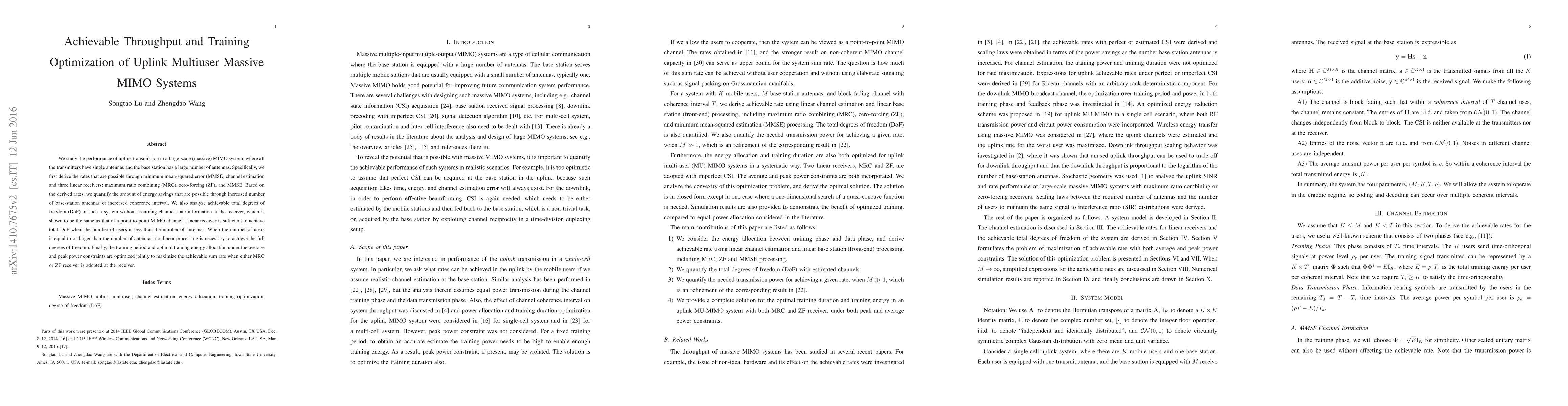 We study the performance of uplink transmission in a large-scale (massive) MIMO system, where all the transmitters have single antennas and the base station has a large number of antennas. Specifically, we first derive the rates that are possible through minimum mean-squared error (MMSE) channel estimation and three linear receivers: maximum ratio combining (MRC), zero-forcing (ZF), and MMSE. Based on the derived rates, we quantify the amount of energy savings that are possible through increased number of base-station antennas or increased coherence interval. We also analyze achievable total degrees of freedom (DoF) of such a system without assuming channel state information at the receiver, which is shown to be the same as that of a point-to-point MIMO channel. Linear receiver is sufficient to achieve total DoF when the number of users is less than the number of antennas. When the number of users is equal to or larger than the number of antennas, nonlinear processing is necessary to achieve the full degrees of freedom. Finally, the training period and optimal training energy allocation under the average and peak power constraints are optimized jointly to maximize the achievable sum rate when either MRC or ZF receiver is adopted at the receiver.