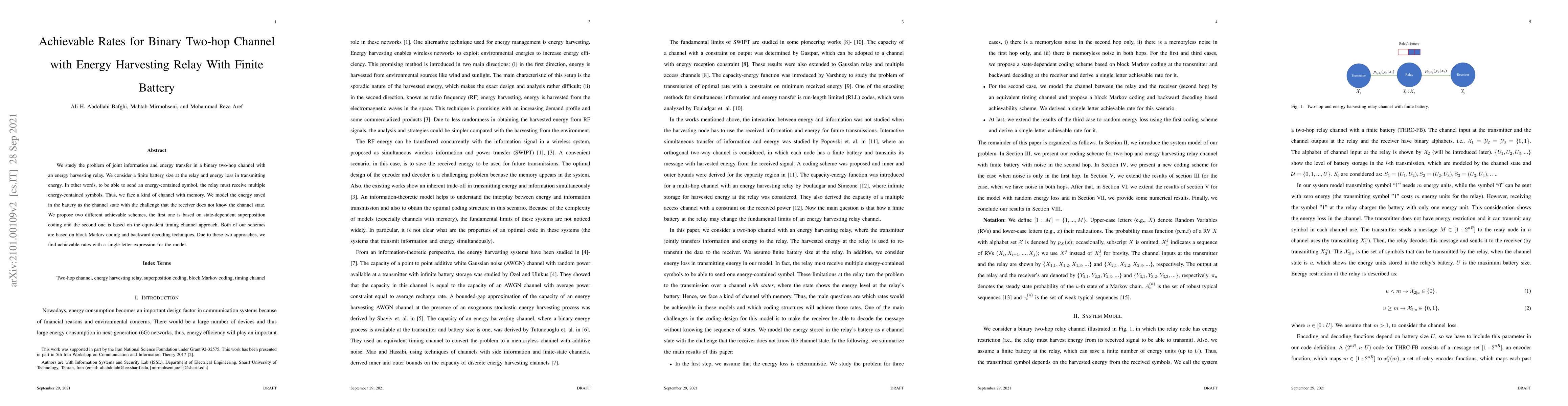 This paper explores joint information and energy transfer in a two-hop channel with an energy harvesting relay that has a finite battery. It proposes two achievable rate schemes based on state-dependent superposition coding and equivalent timing channel approaches, both utilizing block Markov coding and backward decoding to derive single-letter expressions for achievable rates.