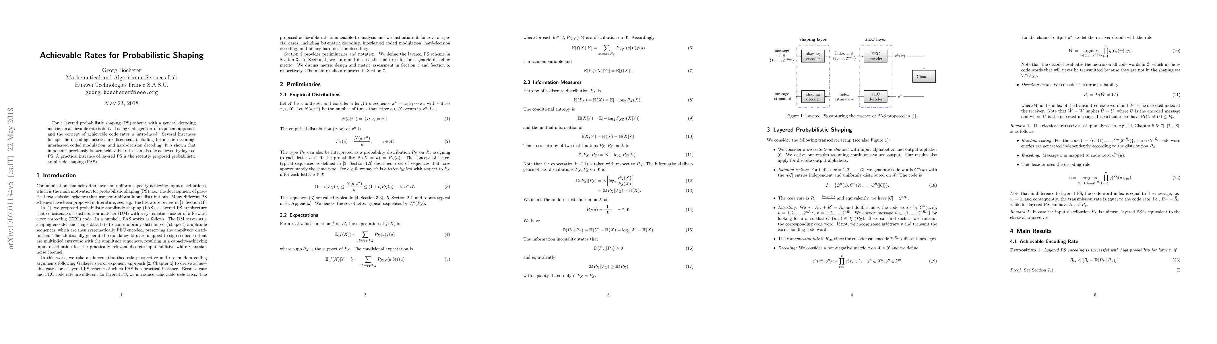 For a layered probabilistic shaping (PS) scheme with a general decoding metric, an achievable rate is derived using Gallager's error exponent approach and the concept of achievable code rates is introduced. Several instances for specific decoding metrics are discussed, including bit-metric decoding, interleaved coded modulation, and hard-decision decoding. It is shown that important previously known achievable rates can also be achieved by layered PS. A practical instance of layered PS is the recently proposed probabilistic amplitude shaping (PAS).