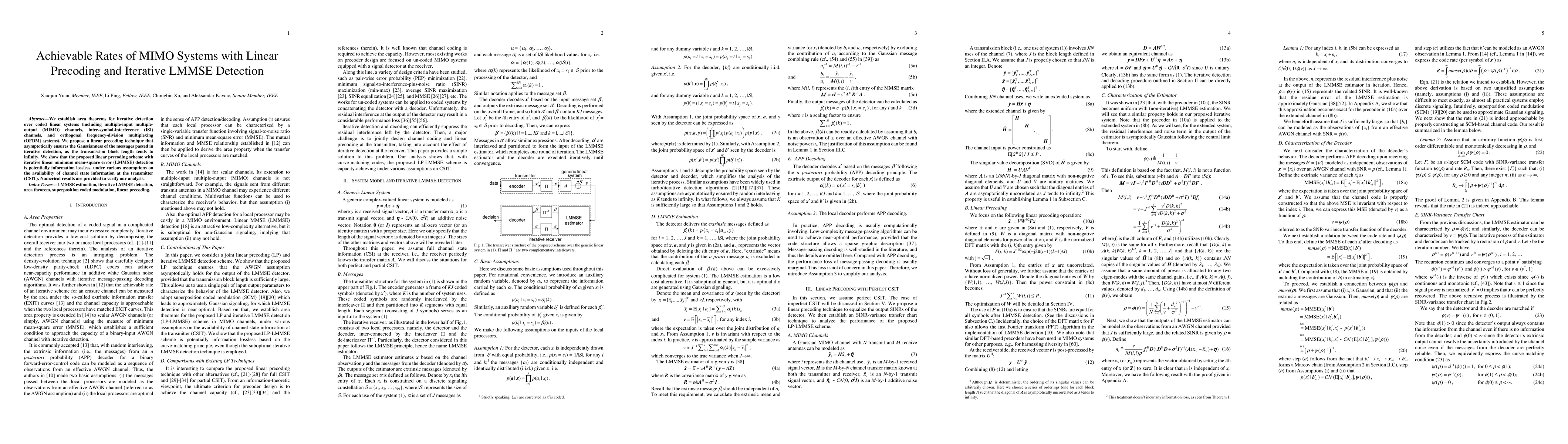 This paper presents area theorems for iterative detection in coded linear systems, including MIMO, ISI, and OFDM channels. It proposes a linear precoding technique that ensures Gaussianness in iterative detection, achieving potentially information lossless performance with iterative LMMSE detection, verified by numerical results.