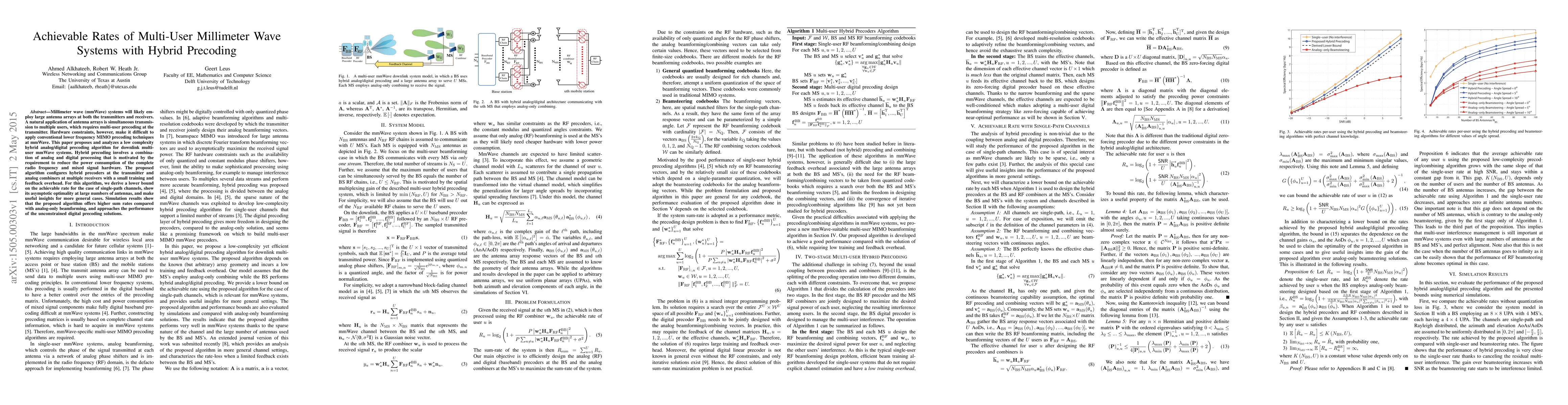 Millimeter wave (mmWave) systems will likely employ large antenna arrays at both the transmitters and receivers. A natural application of antenna arrays is simultaneous transmission to multiple users, which requires multi-user precoding at the transmitter. Hardware constraints, however, make it difficult to apply conventional lower frequency MIMO precoding techniques at mmWave. This paper proposes and analyzes a low complexity hybrid analog/digital beamforming algorithm for downlink multi-user mmWave systems. Hybrid precoding involves a combination of analog and digital processing that is motivated by the requirement to reduce the power consumption of the complete radio frequency and mixed signal hardware. The proposed algorithm configures hybrid precoders at the transmitter and analog combiners at multiple receivers with a small training and feedback overhead. For this algorithm, we derive a lower bound on the achievable rate for the case of single-path channels, show its asymptotic optimality at large numbers of antennas, and make useful insights for more general cases. Simulation results show that the proposed algorithm offers higher sum rates compared with analog-only beamforming, and approaches the performance of the unconstrained digital precoding solutions.