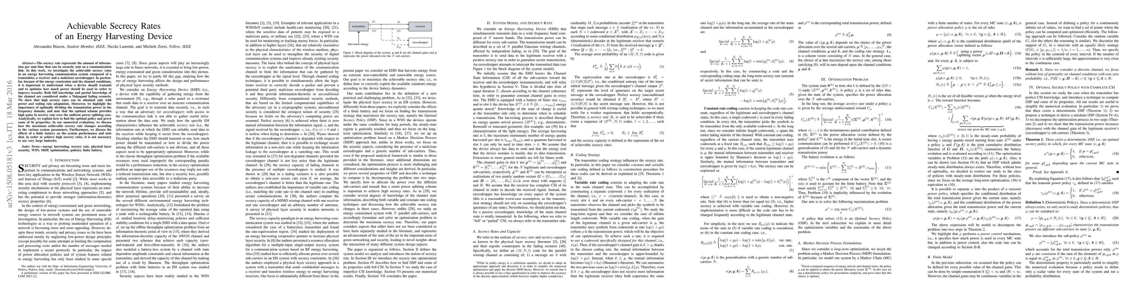 This paper investigates the achievable secrecy rates in an energy harvesting communication system, focusing on optimizing transmission power and coding rates to enhance security under Nakagami fading conditions. The study finds that high secrecy rates require adaptive power and coding strategies, with significant gains from optimal frequency domain power allocation.