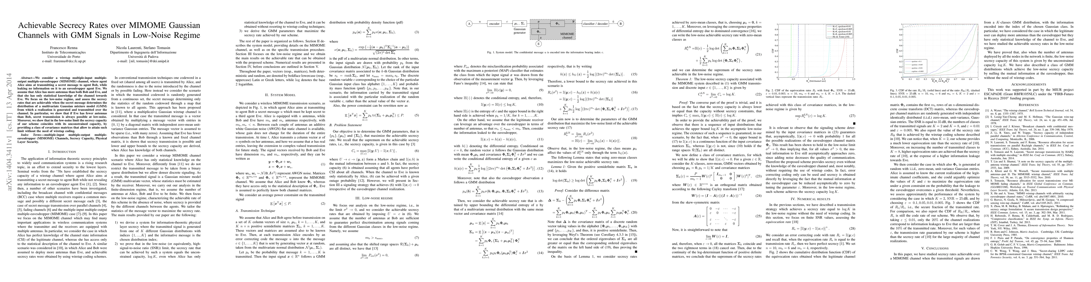 The paper analyzes a MIMOME channel with Gaussian Mixture Model (GMM) signals in a low-noise regime, focusing on secrecy rate achievability for a scenario where Alice transmits to Bob while keeping the message secret from Eve, who has fewer antennas than Bob.