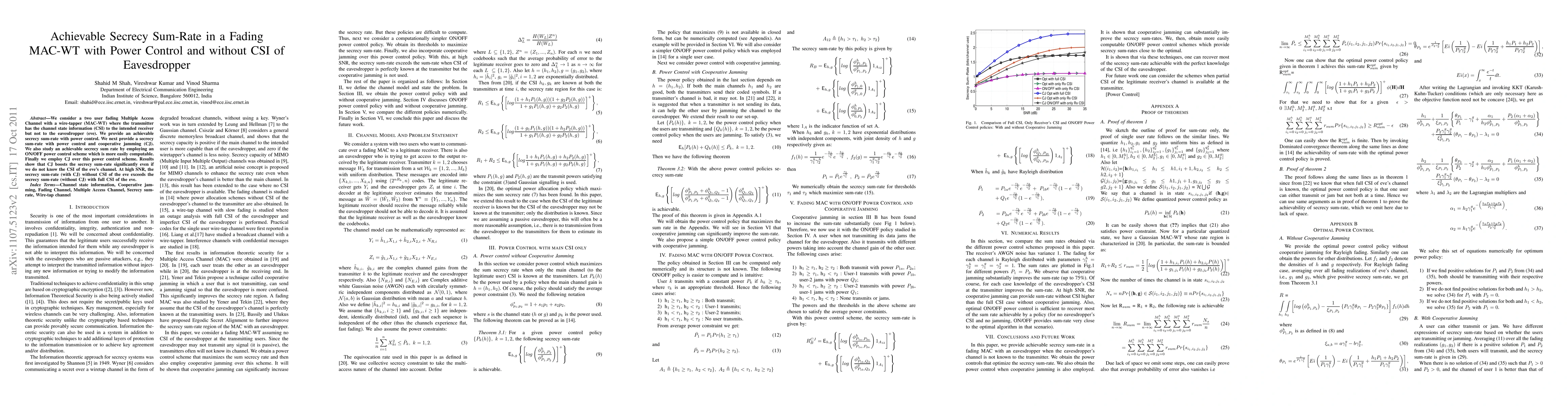 We consider a two user fading Multiple Access Channel with a wire-tapper (MAC-WT) where the transmitter has the channel state information (CSI) to the intended receiver but not to the eavesdropper (eve). We provide an achievable secrecy sum-rate with optimal power control. We next provide a secrecy sum-rate with optimal power control and cooperative jamming (CJ). We then study an achievable secrecy sum rate by employing an ON/OFF power control scheme which is more easily computable. We also employ CJ over this power control scheme. Results show that CJ boosts the secrecy sum-rate significantly even if we do not know the CSI of the eve's channel. At high SNR, the secrecy sum-rate (with CJ) without CSI of the eve exceeds the secrecy sum-rate (without CJ) with full CSI of the eve.