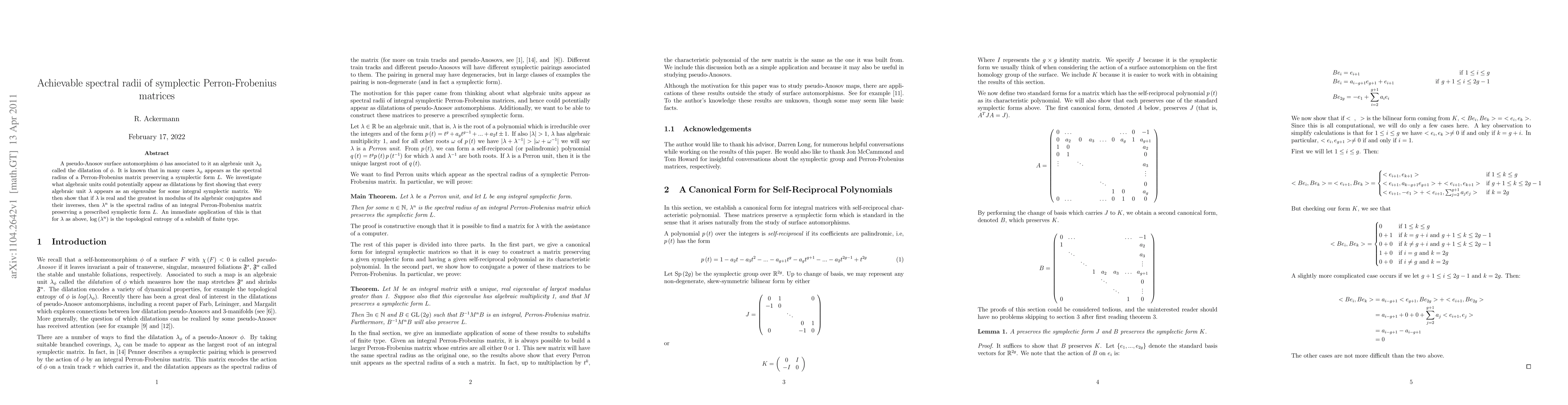 This research paper investigates how certain algebraic units can appear as the spectral radius of symplectic Perron-Frobenius matrices, with implications for understanding topological entropy in subshifts of finite type.