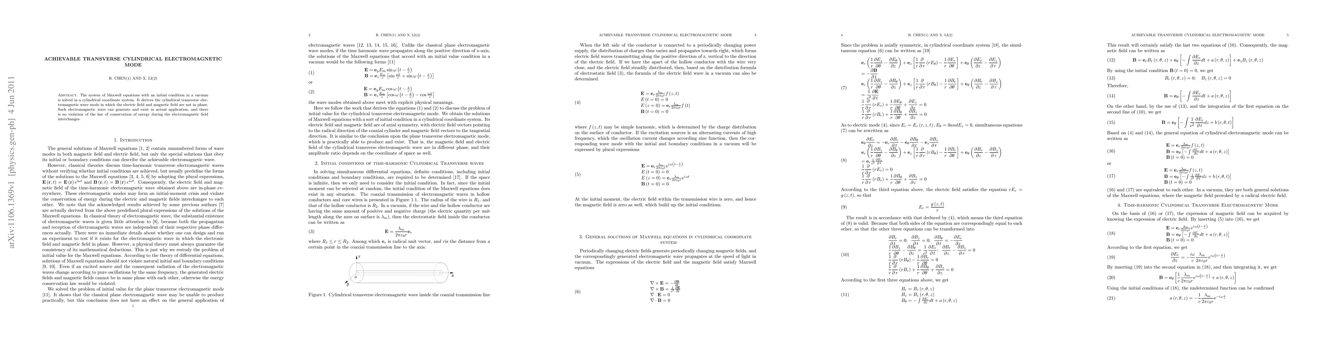 The system of Maxwell equations with an initial condition in a vacuum is solved in a cylindrical coordinate system. It derives the cylindrical transverse electromagnetic wave mode in which the electric field and magnetic field are not in phase. Such electromagnetic wave can generate and exist in actual application, and there is no violation of the law of conservation of energy during the electromagnetic field interchanges.