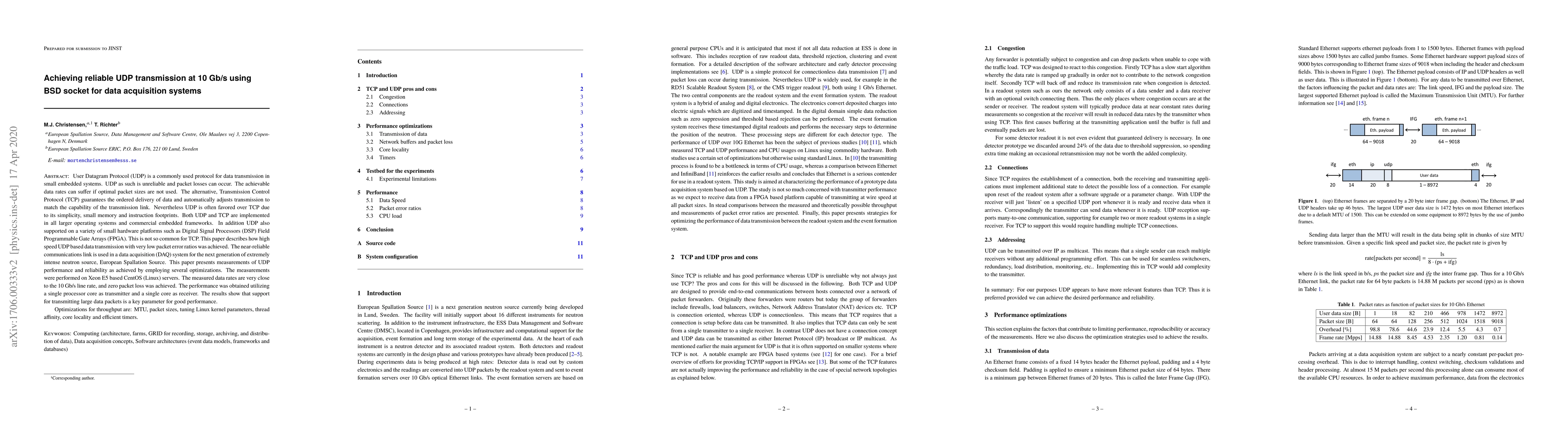 User Datagram Protocol (UDP) is a commonly used protocol for data transmission in small embedded systems. UDP as such is unreliable and packet losses can occur. The achievable data rates can suffer if optimal packet sizes are not used. The alternative, Transmission Control Protocol (TCP) guarantees the ordered delivery of data and automatically adjusts transmission to match the capability of the transmission link. Nevertheless UDP is often favored over TCP due to its simplicity, small memory and instruction footprints. Both UDP and TCP are implemented in all larger operating systems and commercial embedded frameworks. In addition UDP also supported on a variety of small hardware platforms such as Digital Signal Processors (DSP) Field Programmable Gate Arrays (FPGA). This is not so common for TCP. This paper describes how high speed UDP based data transmission with very low packet error ratios was achieved. The near-reliable communications link is used in a data acquisition (DAQ) system for the next generation of extremely intense neutron source, European Spallation Source. This paper presents measurements of UDP performance and reliability as achieved by employing several optimizations. The measurements were performed on Xeon E5 based CentOS (Linux) servers. The measured data rates are very close to the 10 Gb/s line rate, and zero packet loss was achieved. The performance was obtained utilizing a single processor core as transmitter and a single core as receiver. The results show that support for transmitting large data packets is a key parameter for good performance. Optimizations for throughput are: MTU, packet sizes, tuning Linux kernel parameters, thread affinity, core locality and efficient timers.