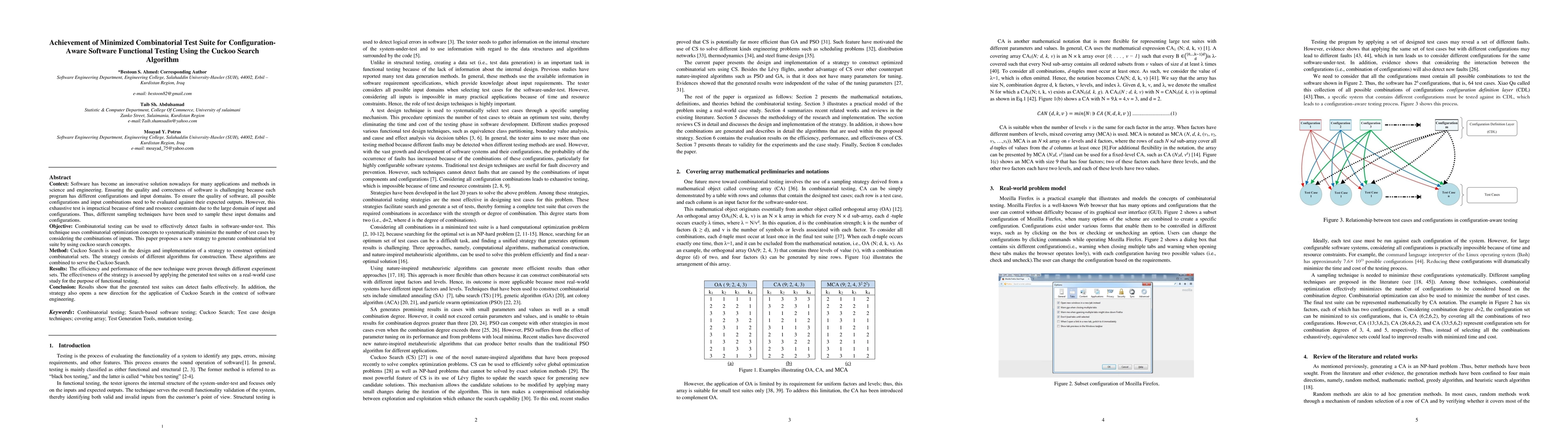 Context: Software has become an innovative solution nowadays for many applications and methods in science and engineering. Ensuring the quality and correctness of software is challenging because each program has different configurations and input domains. To ensure the quality of software, all possible configurations and input combinations need to be evaluated against their expected outputs. However, this exhaustive test is impractical because of time and resource constraints due to the large domain of input and configurations. Thus, different sampling techniques have been used to sample these input domains and configurations. Objective: Combinatorial testing can be used to effectively detect faults in software-under-test. This technique uses combinatorial optimization concepts to systematically minimize the number of test cases by considering the combinations of inputs. This paper proposes a new strategy to generate combinatorial test suite by using cuckoo search concepts. Method: Cuckoo Search is used in the design and implementation of a strategy to construct optimized combinatorial sets. The strategy consists of different algorithms for construction. These algorithms are combined to serve the Cuckoo Search. Results: The efficiency and performance of the new technique were proven through different experiment sets. The effectiveness of the strategy is assessed by applying the generated test suites on a real-world case study for the purpose of functional testing. Conclusion: Results show that the generated test suites can detect faults effectively. In addition, the strategy also opens a new direction for the application of Cuckoo Search in the context of software engineering.