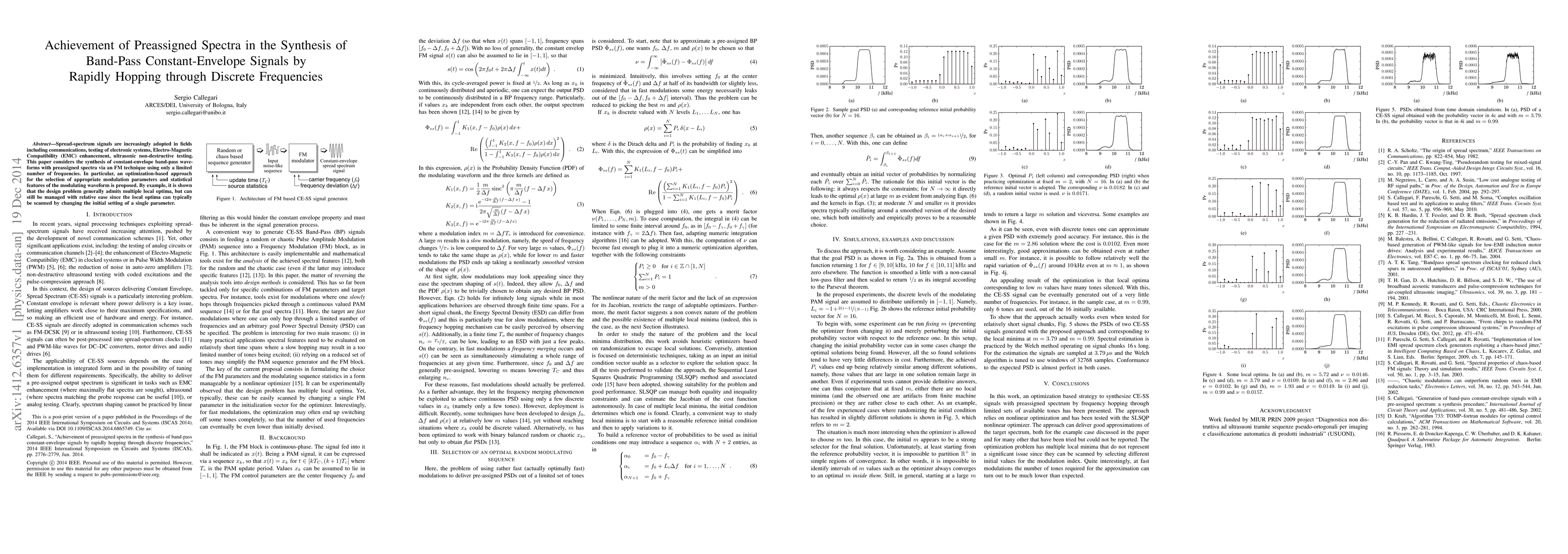 Spread-spectrum signals are increasingly adopted in fields including communications, testing of electronic systems, Electro-Magnetic Compatibility (EMC) enhancement, ultrasonic non-destructive testing. This paper considers the synthesis of constant-envelope band-pass wave-forms with preassigned spectra via an FM technique using only a limited number of frequencies. In particular, an optimization-based approach for the selection of appropriate modulation parameters and statistical features of the modulating waveform is proposed. By example, it is shown that the design problem generally admits multiple local optima, but can still be managed with relative ease since the local optima can typically be scanned by changing the initial setting of a single parameter.