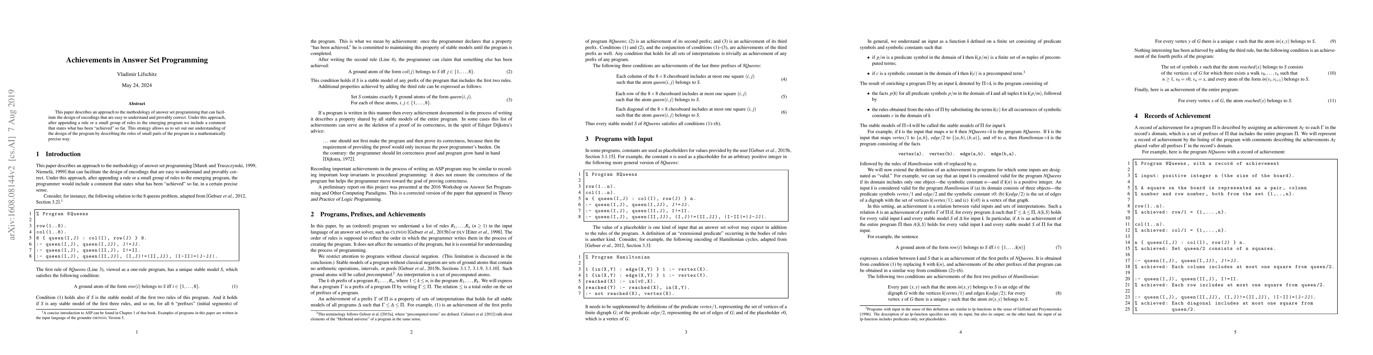 This paper proposes a methodology for answer set programming (ASP) that enhances the design of understandable and provably correct encodings by including comments that precisely describe the "achievements" of small program components. This approach aids in mathematically precise documentation of the program's design and functionality.