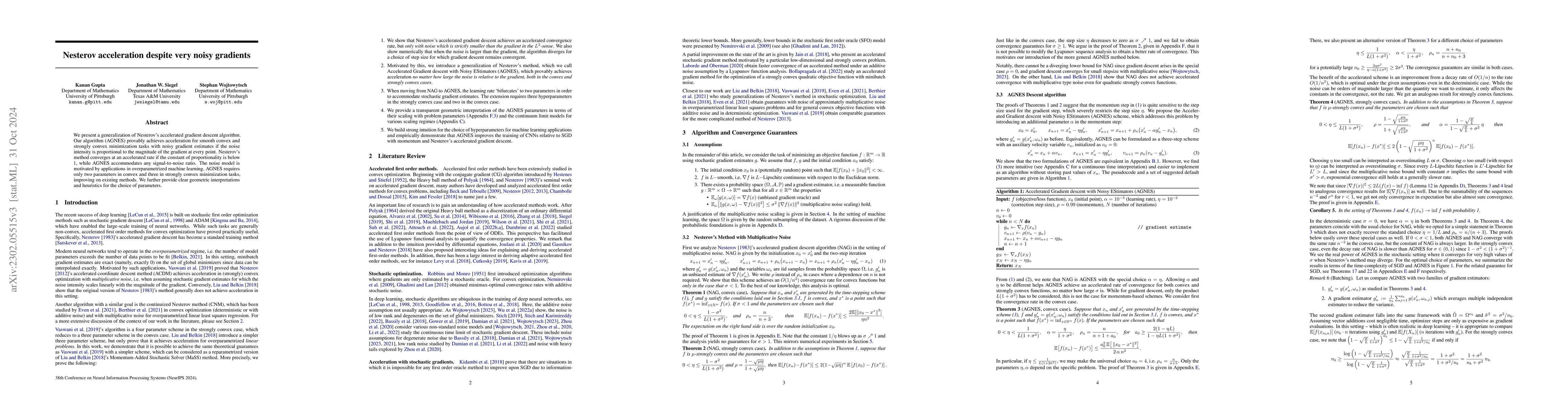 We present a generalization of Nesterov's accelerated gradient descent algorithm. Our algorithm (AGNES) provably achieves acceleration for smooth convex minimization tasks with noisy gradient estimates if the noise intensity is proportional to the magnitude of the gradient. Nesterov's accelerated gradient descent does not converge under this noise model if the constant of proportionality exceeds one. AGNES fixes this deficiency and provably achieves an accelerated convergence rate no matter how small the signal to noise ratio in the gradient estimate. Empirically, we demonstrate that this is an appropriate model for mini-batch gradients in overparameterized deep learning. Finally, we show that AGNES outperforms stochastic gradient descent with momentum and Nesterov's method in the training of CNNs.