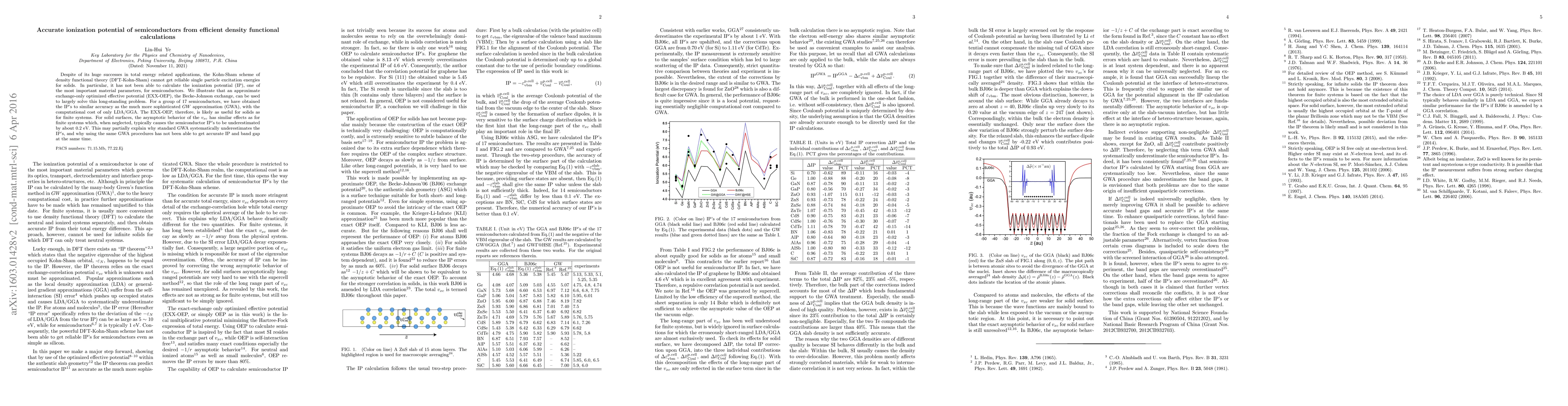 Despite of its huge successes in vast amount of applications, the Kohn-Sham scheme of density functional theory (DFT-Kohn-Sham) has not been able to get reliable ionization potentials (IP) for semiconductors, due to self-interaction error in the local density approximation (LDA) and generalized gradient approximations (GGA), and the difficulty of using asymptotically long-ranged potentials for surface calculations. An approximate optimize effective potential (OEP), the Becke-Johnson'06 exchange, is used to explore the capability of OEP to calculate semiconductor IP with a surface technique suitable for both short- and long-ranged potentials. Combined with the LDA correlation, the approximate OEP has achieved an IP accuracy for 17 semiconductors which is similar to the much more sophisticated $GW$ approximation (GWA), with the computational cost of only LDA/GGA. For the first time, this opens the way for systematic calculation of semiconductor IP's by the DFT-Kohn-Sham scheme. The long-range part of the $v_{xc}$ is not as important for solid surface as for atoms and molecules since the wave functions are mainly bound to the slab while less exposed to the asymptotic region. Nevertheless, it contributes significantly to the total IP and therefore shall not be simply ignored. Without including its effects, it is unlikely that the same GWA procedure could achieve universally accurate band gaps and accurate IP's at the same time, as is indeed seen in practical calculations.