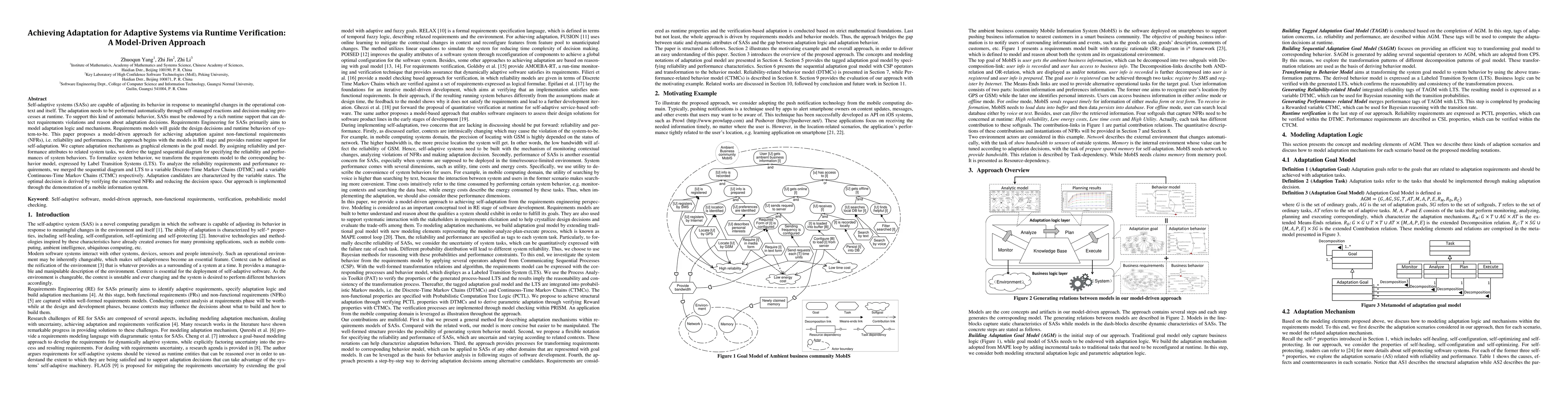 This paper proposes a model-driven approach for enabling self-adaptation in self-adaptive systems by integrating runtime verification. It models adaptation logic and mechanisms to address non-functional requirements like reliability and performance, transforming requirements into behavior models and analyzing them using Markov Chains to derive optimal adaptation decisions.