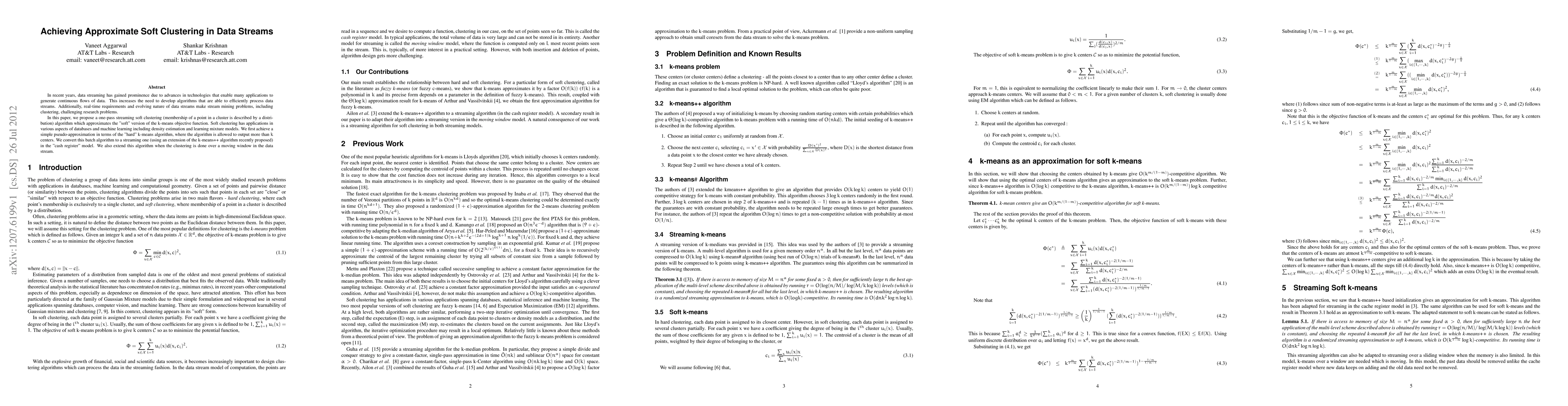 This paper proposes a one-pass streaming algorithm for approximate soft clustering in data streams, adapting the k-means++ algorithm to handle the evolving nature of streaming data. The method aims to approximate the soft k-means objective function, which is useful for density estimation and learning mixture models.