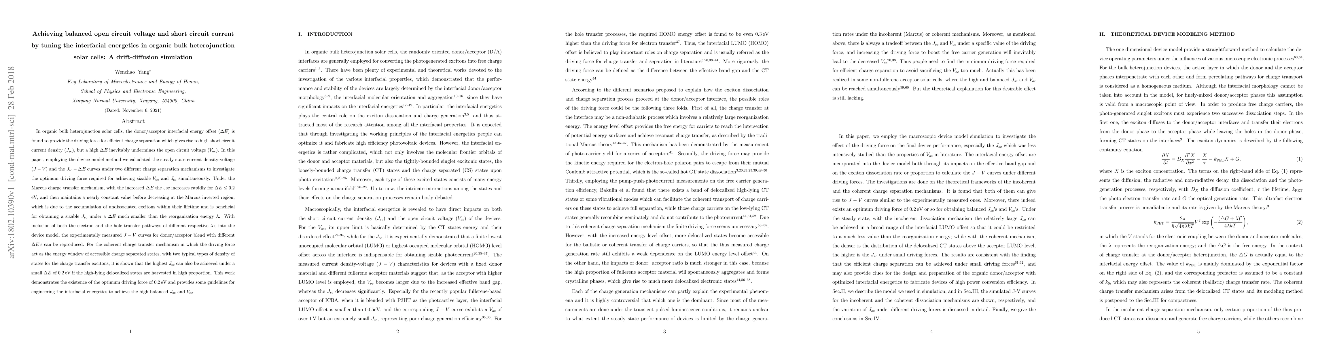 Researchers found that tuning the interfacial energetics in organic solar cells can achieve a balance between high short circuit current and open circuit voltage by optimizing the driving force for charge separation, with an optimum value of 0.2 eV.
