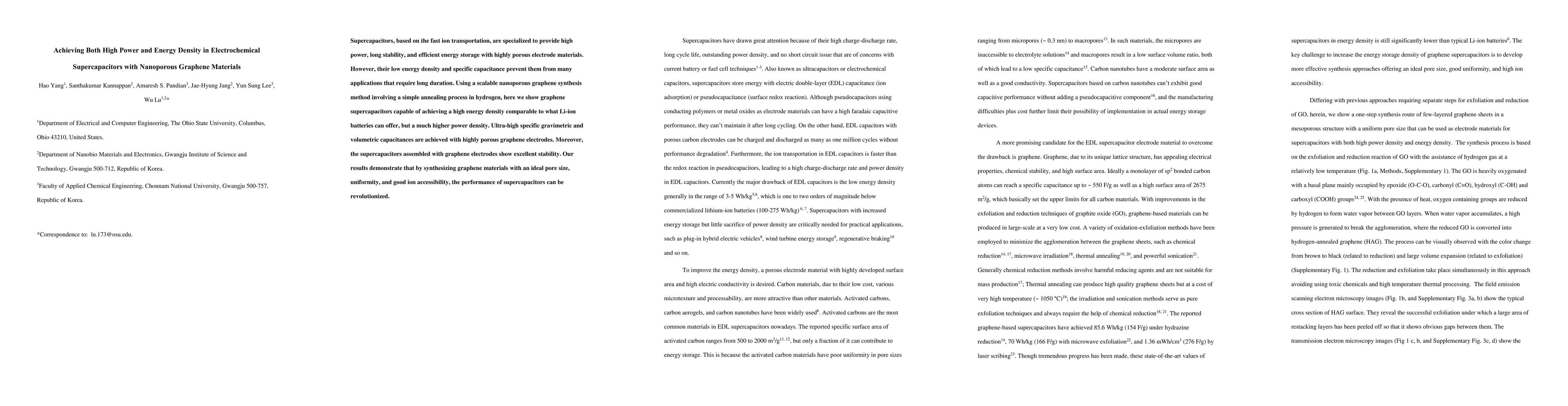 This study develops nanoporous graphene materials via a scalable annealing process to achieve high power and energy density in supercapacitors, achieving energy density comparable to Li-ion batteries while maintaining much higher power density, along with excellent stability. The synthesis method focuses on ideal pore size, uniformity, and ion accessibility for superior performance.