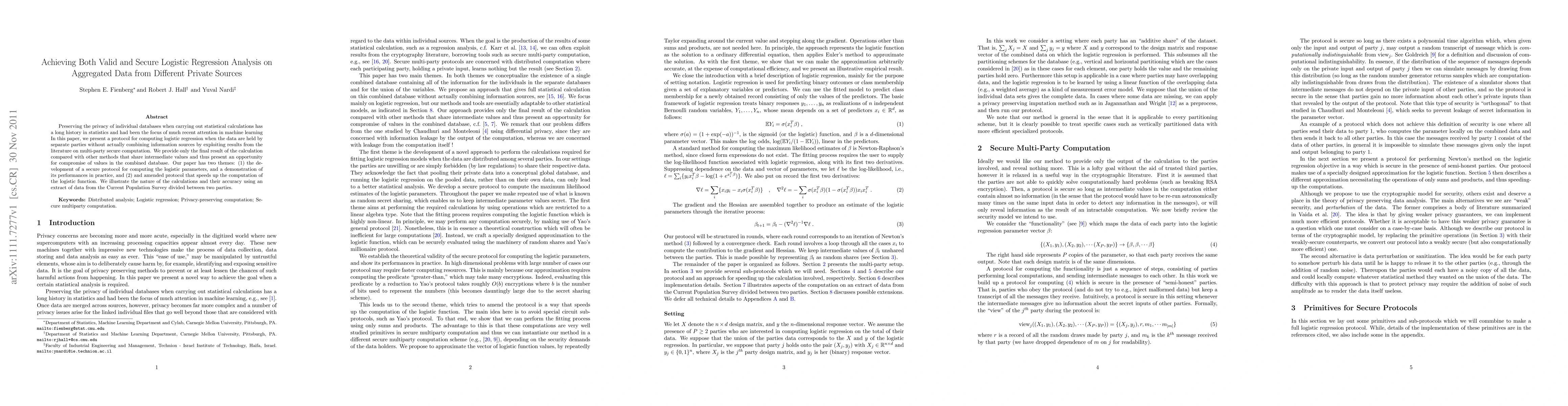Preserving the privacy of individual databases when carrying out statistical calculations has a long history in statistics and had been the focus of much recent attention in machine learning In this paper, we present a protocol for computing logistic regression when the data are held by separate parties without actually combining information sources by exploiting results from the literature on multi-party secure computation. We provide only the final result of the calculation compared with other methods that share intermediate values and thus present an opportunity for compromise of values in the combined database. Our paper has two themes: (1) the development of a secure protocol for computing the logistic parameters, and a demonstration of its performances in practice, and (2) and amended protocol that speeds up the computation of the logistic function. We illustrate the nature of the calculations and their accuracy using an extract of data from the Current Population Survey divided between two parties.