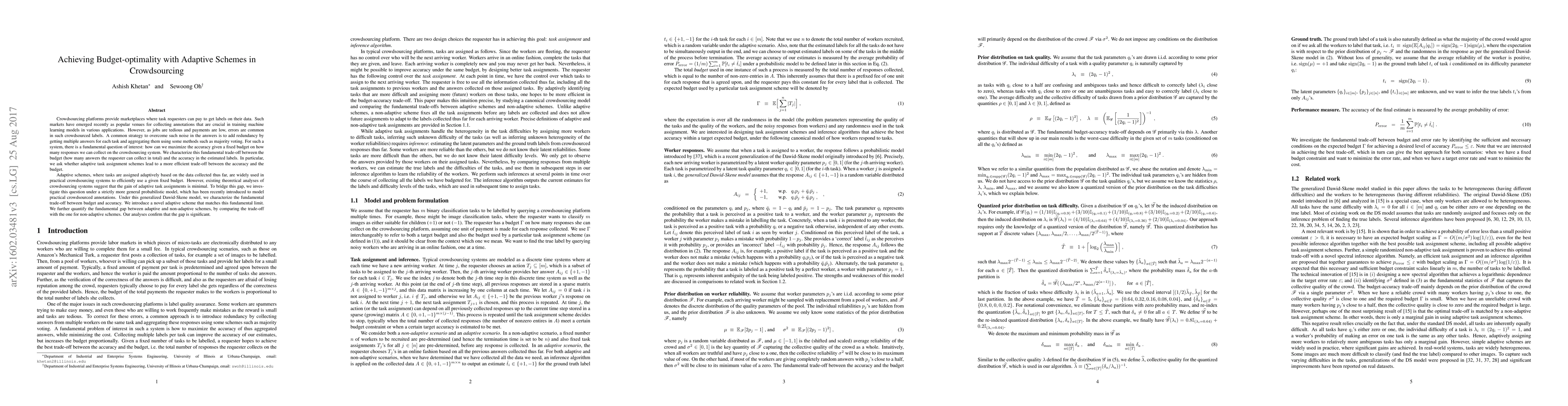This paper investigates adaptive task assignment schemes in crowdsourcing to optimize budget-accuracy trade-offs under a generalized Dawid-Skene model. It introduces a novel adaptive scheme that significantly outperforms non-adaptive approaches, demonstrating a substantial gap in efficiency.