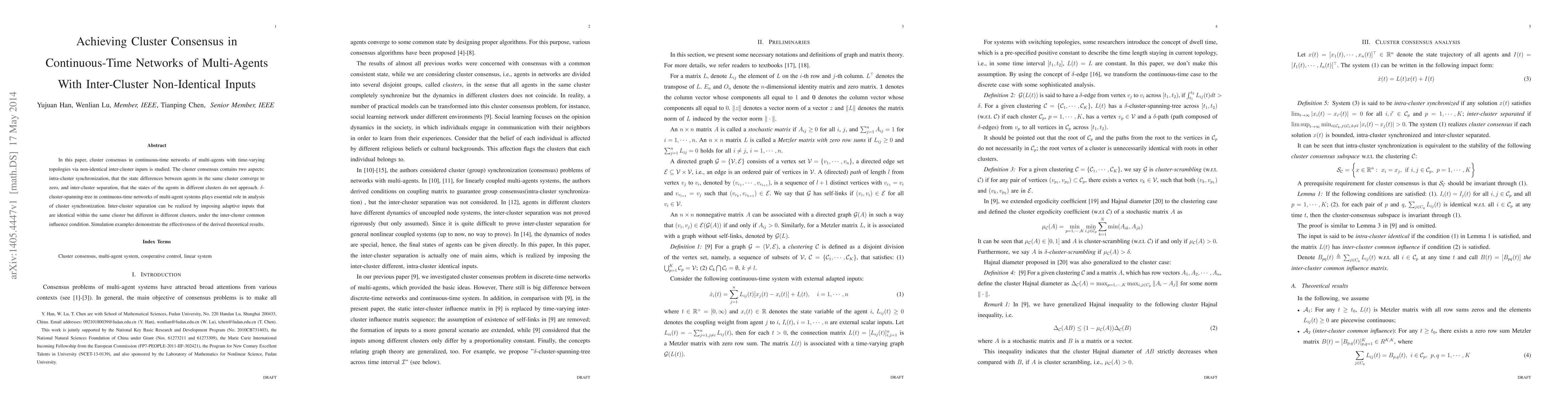 This paper explores cluster consensus in continuous-time multi-agent networks with non-identical inter-cluster inputs and adaptive strategies. It focuses on achieving intra-cluster synchronization and inter-cluster separation using $\delta$-cluster-spanning-trees and adaptive inputs, validated by simulation examples.