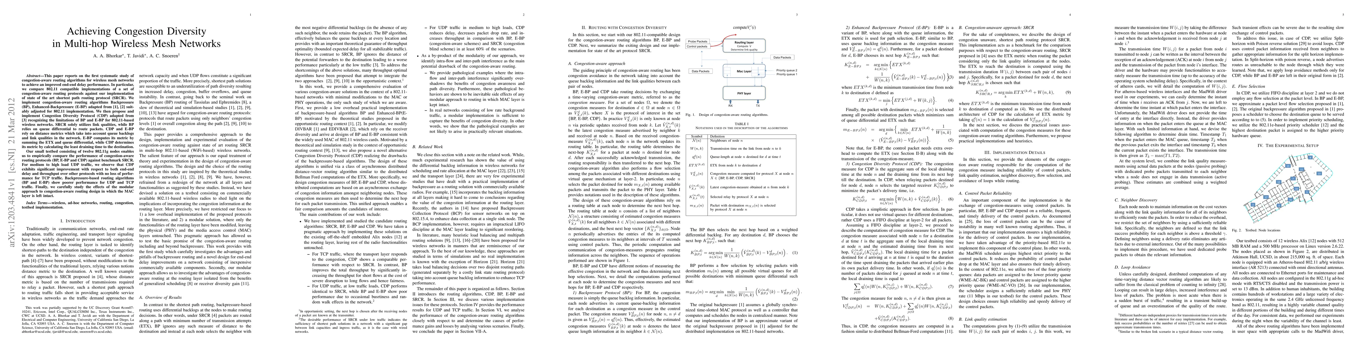 A study on congestion-aware routing algorithms for wireless mesh networks found that a new protocol called Congestion Diversity Protocol (CDP) outperforms other protocols in achieving improved end-end delay performance for both UDP and TCP traffic.
