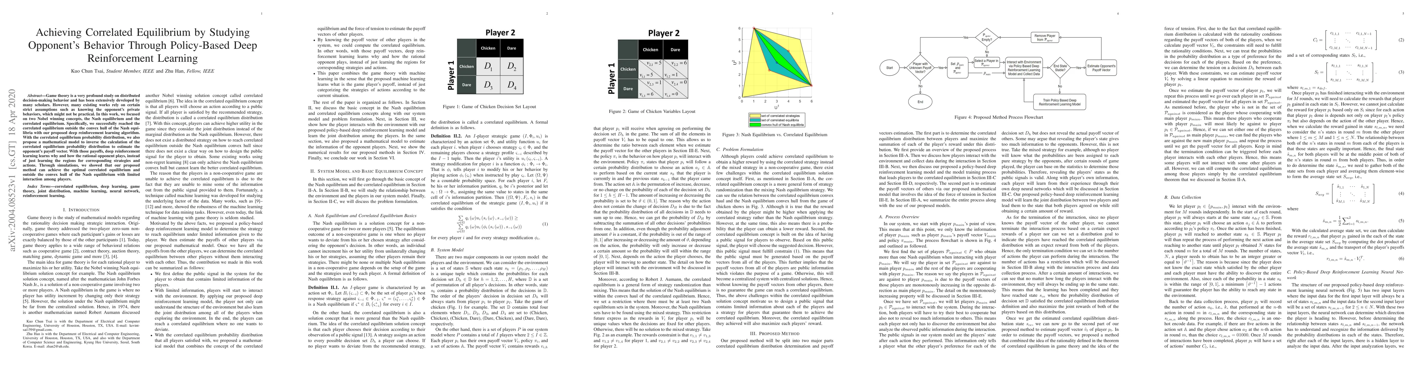 Game theory is a very profound study on distributed decision-making behavior and has been extensively developed by many scholars. However, many existing works rely on certain strict assumptions such as knowing the opponent's private behaviors, which might not be practical. In this work, we focused on two Nobel winning concepts, the Nash equilibrium and the correlated equilibrium. Specifically, we successfully reached the correlated equilibrium outside the convex hull of the Nash equilibria with our proposed deep reinforcement learning algorithm. With the correlated equilibrium probability distribution, we also propose a mathematical model to inverse the calculation of the correlated equilibrium probability distribution to estimate the opponent's payoff vector. With those payoffs, deep reinforcement learning learns why and how the rational opponent plays, instead of just learning the regions for corresponding strategies and actions. Through simulations, we showed that our proposed method can achieve the optimal correlated equilibrium and outside the convex hull of the Nash equilibrium with limited interaction among players.