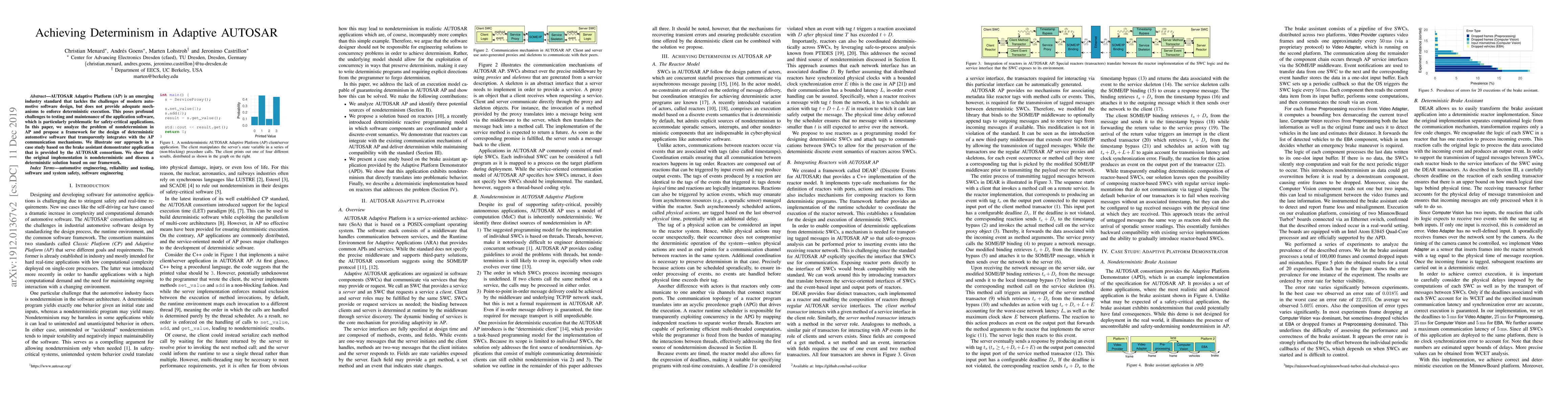 This paper addresses the lack of determinism in the AUTOSAR Adaptive Platform, proposing a framework to achieve deterministic execution that integrates seamlessly with the platform's communication mechanisms. The authors demonstrate their approach through a case study on the brake assistant application, showing how to convert its nondeterministic implementation into a deterministic one.