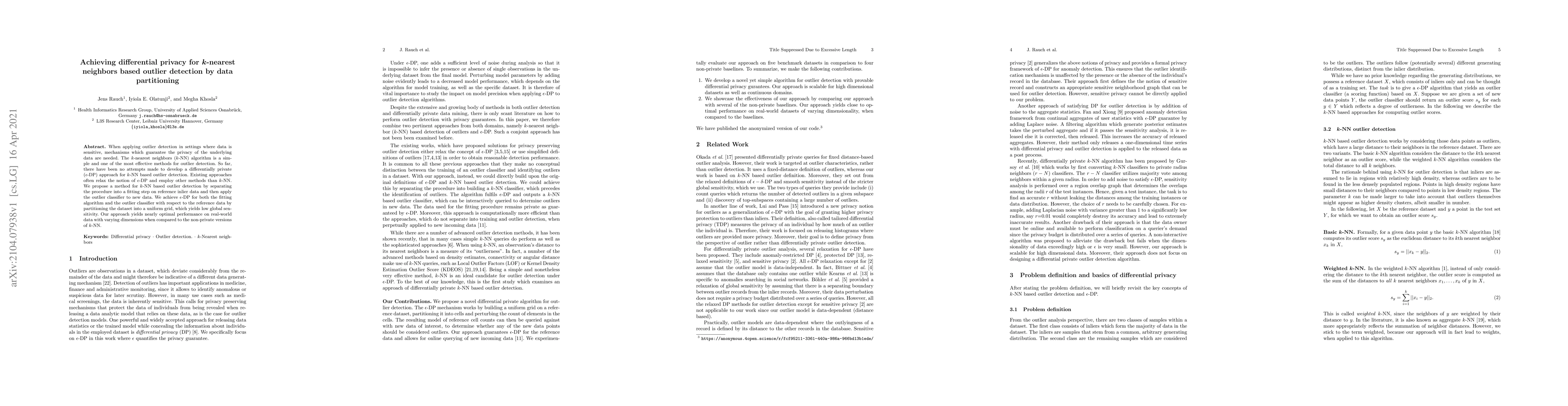 This paper proposes a differentially private method for $k$-NN based outlier detection by partitioning the dataset into a uniform grid, achieving $\epsilon$-DP for both the fitting and outlier classification steps. The approach maintains nearly optimal performance on real-world data compared to non-private $k$-NN methods.