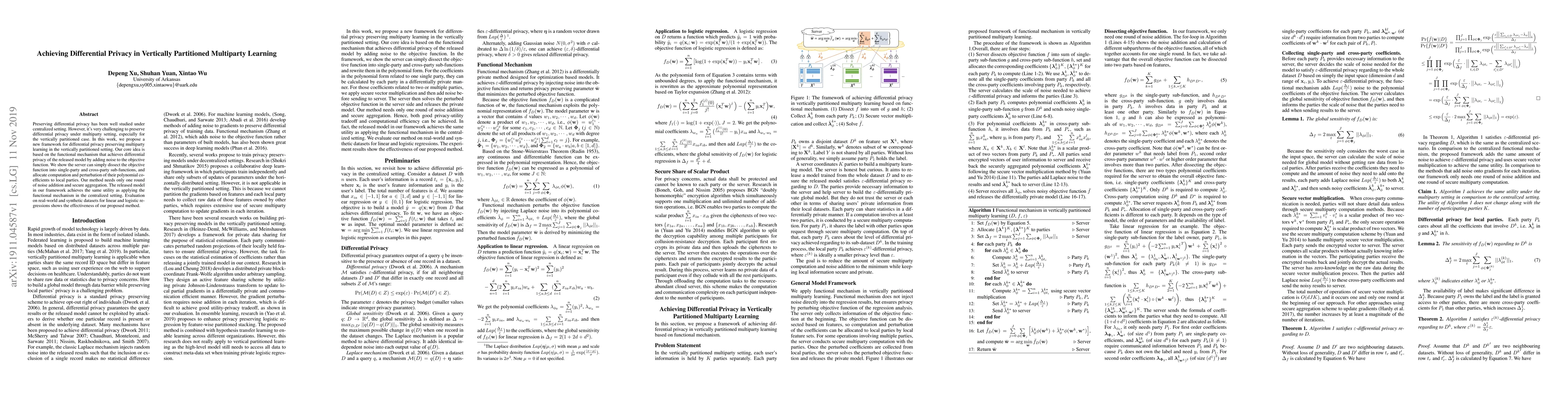 This paper proposes a new framework for achieving differential privacy in vertically partitioned multiparty learning, utilizing a functional mechanism to add noise to the objective function. The method involves dissecting the objective function into single-party and cross-party sub-functions, with noise allocation and computation distributed among local parties, requiring only one round of noise addition and secure aggregation.