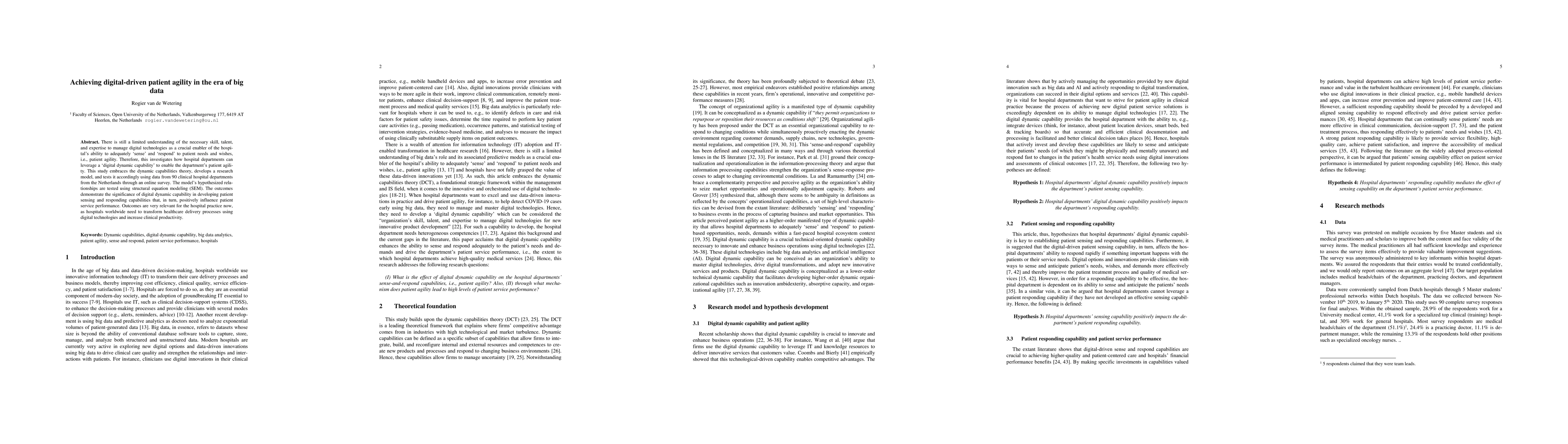 There is still a limited understanding of the necessary skill, talent, and expertise to manage digital technologies as a crucial enabler of the hospitals ability to adequately sense and respond to patient needs and wishes, i.e., patient agility. Therefore, this investigates how hospital departments can leverage a digital dy-namic capability to enable the departments patient agility. This study embraces the dynamic capabilities theory, develops a research model, and tests it accordingly using data from 90 clinical hospital departments from the Netherlands through an online survey. The model's hypothesized relationships are tested using structural equation modeling (SEM). The outcomes demonstrate the significance of digital dynamic capability in developing patient sensing and responding capabili-ties that, in turn, positively influence patient service performance. Outcomes are very relevant for the hospital practice now, as hospitals worldwide need to trans-form healthcare delivery processes using digital technologies and increase clinical productivity.