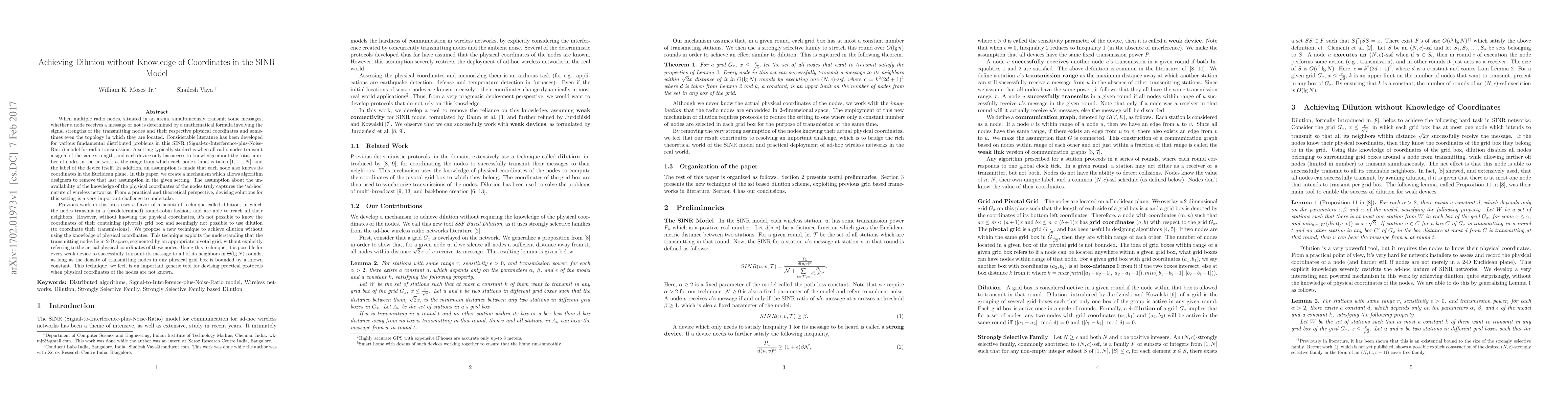 This paper proposes a novel technique to achieve dilution in the SINR model without requiring nodes to know their physical coordinates, addressing the "ad-hoc" nature of wireless networks. It enables weak devices to transmit messages to all neighbors in $\Theta(\lg N)$ rounds by leveraging a grid-based segmentation of the 2-D space, without referencing actual coordinates.