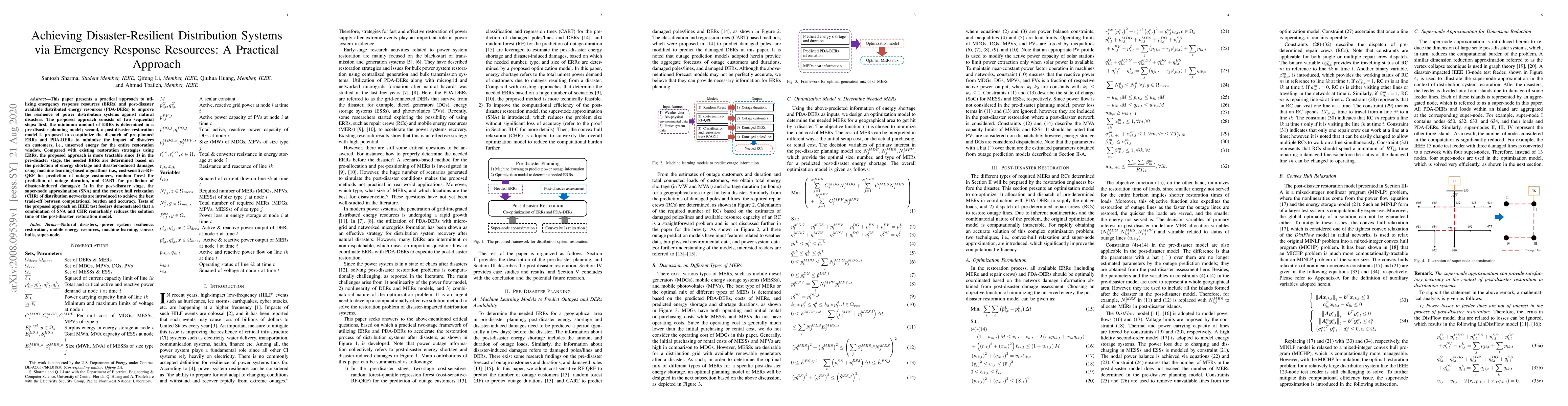 This paper presents a practical approach to utilizing emergency response resources (ERRs) and post-disaster available distributed energy resources (PDA-DERs) to improve the resilience of power distribution systems against natural disasters. The proposed approach consists of two sequential steps: first, the minimum amount of ERRs is determined in a pre-disaster planning model; second, a post-disaster restoration model is proposed to co-optimize the dispatch of pre-planned ERRs and PDA-DERs to minimize the impact of disasters on customers, i.e., unserved energy for the entire restoration window. Compared with existing restoration strategies using ERRs, the proposed approach is more tractable since 1) in the pre-disaster stage, the needed EERs are determined based on the prediction of energy shortage and disaster-induced damages using machine learning-based algorithms (i.e., cost-sensitive-RFQRF for prediction of outage customers, random forest for prediction of outage duration, and CART for prediction of disaster-induced damages); 2) in the post-disaster stage, the super-node approximation (SNA) and the convex hull relaxation (CHR) of distribution networks are introduced to achieve the best trade-off between computational burden and accuracy. Tests of the proposed approach on IEEE test feeders demonstrated that a combination of SNA and CHR remarkably reduces the solution time of the post-disaster restoration model.