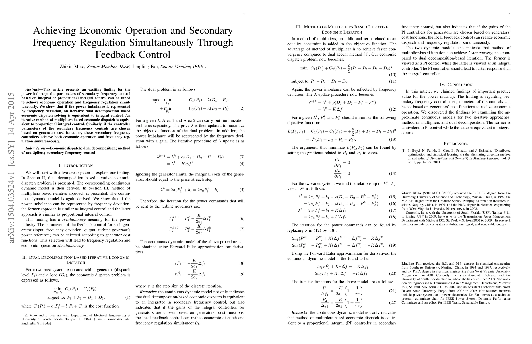 This article presents an exciting finding for the power industry: the parameters of secondary frequency control based on integral or proportional integral control can be tuned to achieve economic operation and frequency regulation simultaneously. We show that if the power imbalance is represented by frequency deviation, an iterative dual decomposition based economic dispatch solving is equivalent to integral control. An iterative method of multipliers based economic dispatch is equivalent to proportional integral control. Similarly, if the controller parameters of the secondary frequency controls are chosen based on generator cost functions, these secondary frequency controllers achieve both economic operation and frequency regulation simultaneously.