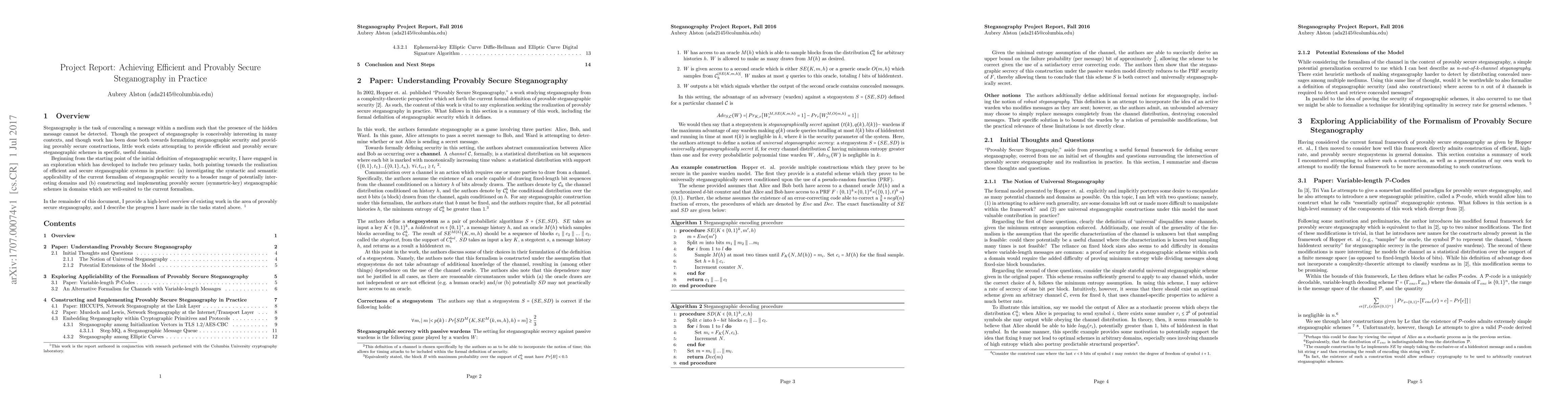 Steganography is the task of concealing a message within a medium such that the presence of the hidden message cannot be detected. Though the prospect of steganography is conceivably interesting in many contexts, and though work has been done both towards formalizing steganographic security and providing provably secure constructions, little work exists attempting to provide efficient and provably secure steganographic schemes in specific, useful domains. Beginning from the starting point of the initial definition of steganographic security, I have engaged in an exploration which has developed to include two primary tasks, both pointing towards the realization of efficient and secure steganographic systems in practice: (a) investigating the syntactic and semantic applicability of the current formalism of steganographic security to a broader range of potentially interesting domains and (b) constructing and implementing provably secure (symmetric-key) steganographic schemes in domains which are well-suited to the current formalism.
