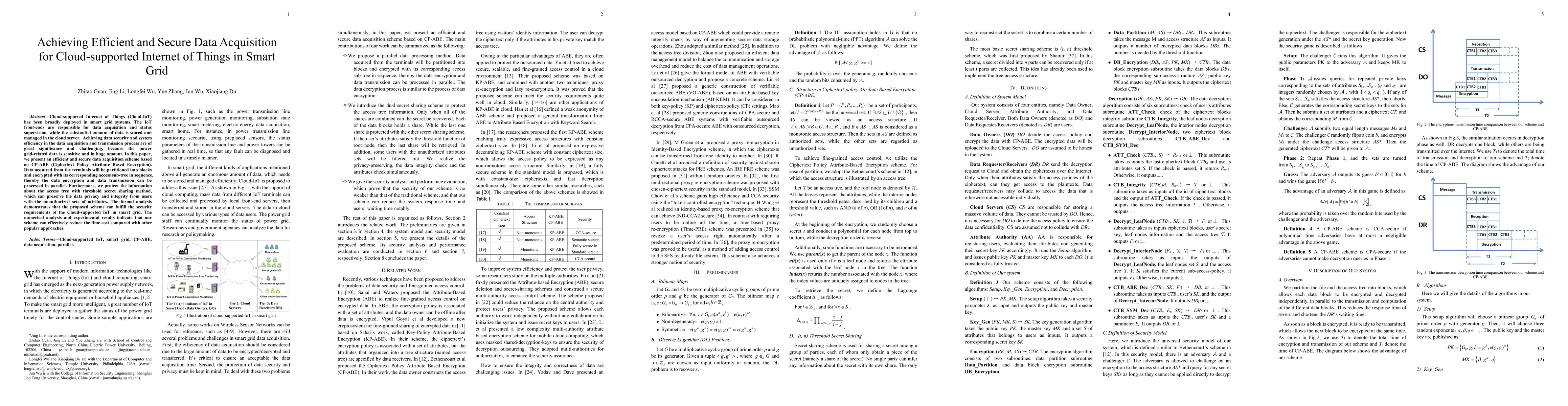 This paper proposes an efficient and secure data acquisition scheme for Cloud-supported Internet of Things in smart grids using CP-ABE, enabling parallel encryption and data transmission. It employs threshold secret sharing to protect access tree information, ensuring data privacy and integrity while reducing time costs compared to other methods.