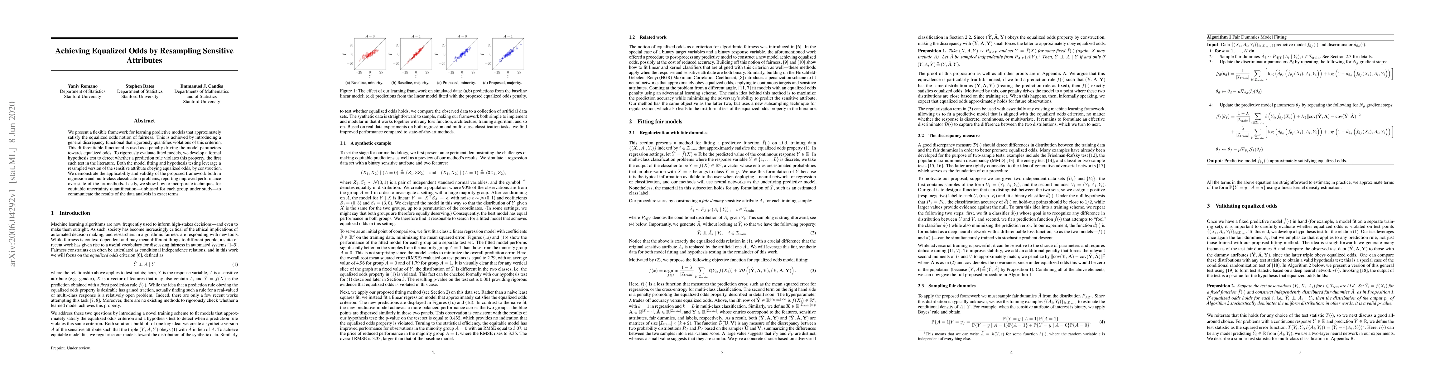 We present a flexible framework for learning predictive models that approximately satisfy the equalized odds notion of fairness. This is achieved by introducing a general discrepancy functional that rigorously quantifies violations of this criterion. This differentiable functional is used as a penalty driving the model parameters towards equalized odds. To rigorously evaluate fitted models, we develop a formal hypothesis test to detect whether a prediction rule violates this property, the first such test in the literature. Both the model fitting and hypothesis testing leverage a resampled version of the sensitive attribute obeying equalized odds, by construction. We demonstrate the applicability and validity of the proposed framework both in regression and multi-class classification problems, reporting improved performance over state-of-the-art methods. Lastly, we show how to incorporate techniques for equitable uncertainty quantification---unbiased for each group under study---to communicate the results of the data analysis in exact terms.