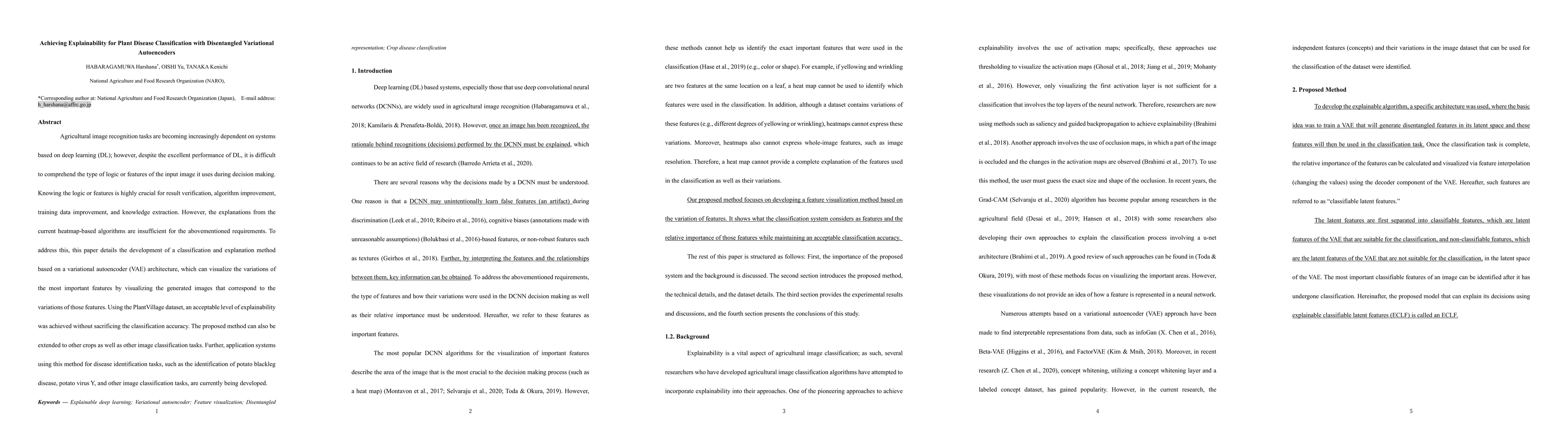 Agricultural image recognition tasks are becoming increasingly dependent on deep learning (DL); however, despite the excellent performance of DL, it is difficult to comprehend the type of logic or features of the input image it uses during decision making. Knowing the logic or features is highly crucial for result verification, algorithm improvement, training data improvement, and knowledge extraction. However, the explanations from the current heatmap-based algorithms are insufficient for the abovementioned requirements. To address this, this paper details the development of a classification and explanation method based on a variational autoencoder (VAE) architecture, which can visualize the variations of the most important features by visualizing the generated images that correspond to the variations of those features. Using the PlantVillage dataset, an acceptable level of explainability was achieved without sacrificing the classification accuracy. The proposed method can also be extended to other crops as well as other image classification tasks. Further, application systems using this method for disease identification tasks, such as the identification of potato blackleg disease, potato virus Y, and other image classification tasks, are currently being developed.