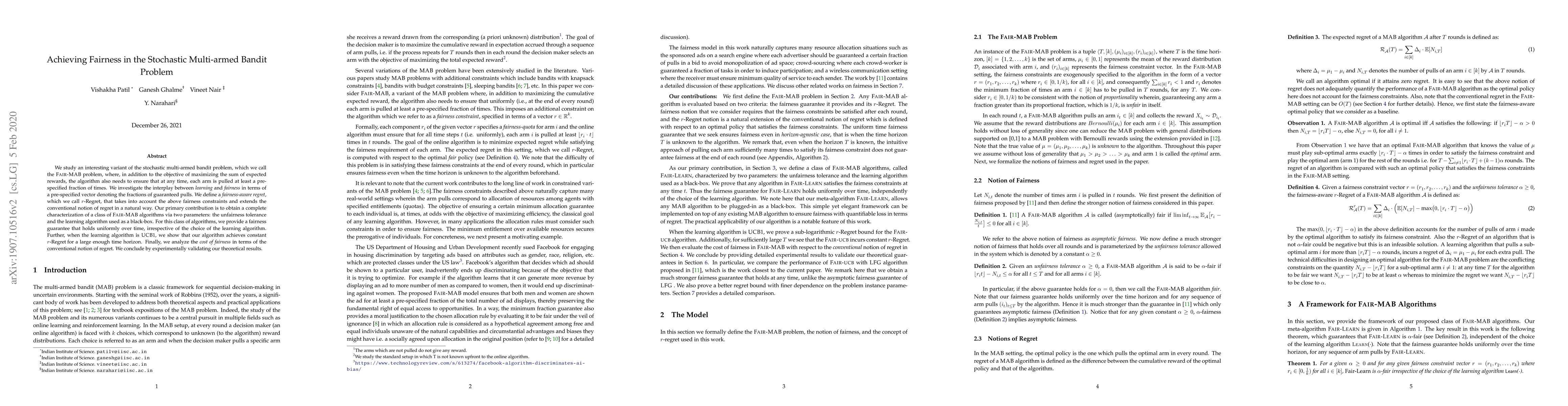 Researchers developed a fairness-aware algorithm for the stochastic multi-armed bandit problem, achieving $O( ext{ln} T)$ regret while ensuring each arm is pulled a fraction of the total rounds.