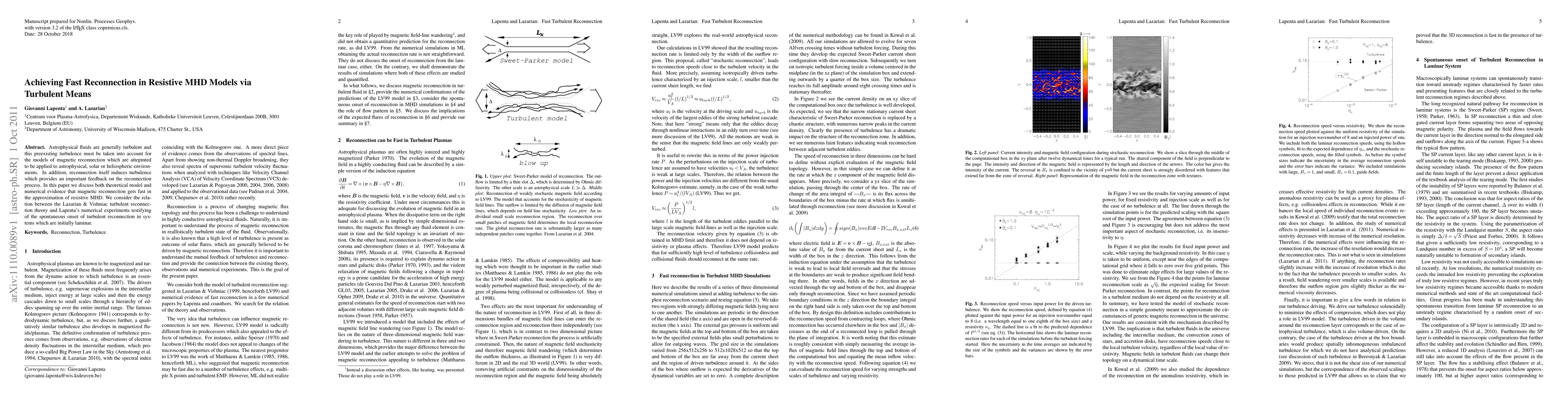 This paper explores how preexisting turbulence in astrophysical fluids accelerates magnetic reconnection in resistive magnetohydrodynamic (MHD) models. It combines theoretical insights from turbulent reconnection theory with numerical evidence showing that reconnection can spontaneously become turbulent even in initially laminar systems.