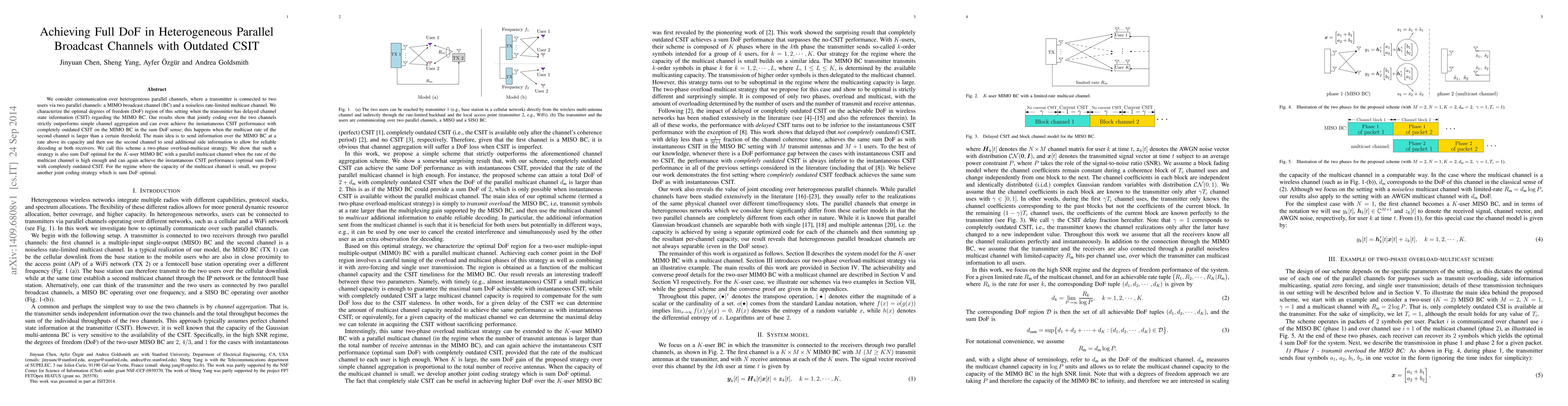 This paper investigates communication over heterogeneous parallel channels, achieving full degrees of freedom (DoF) with outdated channel state information (CSIT) on a MIMO broadcast channel. It proposes a two-phase overload-multicast strategy that outperforms simple channel aggregation, achieving optimal sum DoF performance even with outdated CSIT when the multicast rate is sufficiently high.