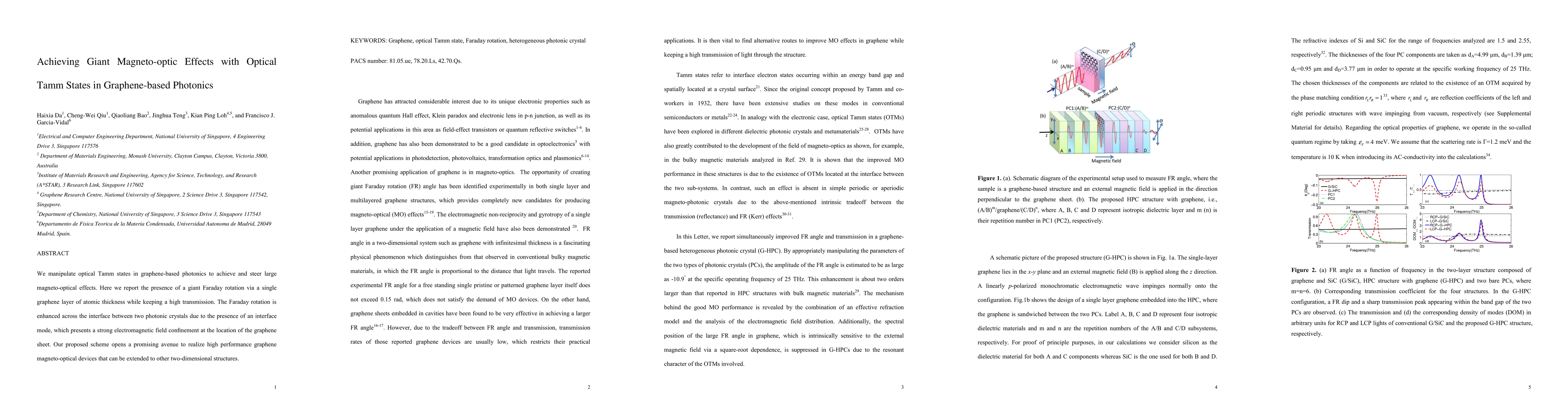 We manipulate optical Tamm states in graphene-based photonics to achieve and steer large magneto-optical effects. Here we report the presence of a giant Faraday rotation via a single graphene layer of atomic thickness while keeping a high transmission. The Faraday rotation is enhanced across the interface between two photonic crystals due to the presence of an interface mode, which presents a strong electromagnetic field confinement at the location of the graphene sheet. Our proposed scheme opens a promising avenue to realize high performance graphene magneto-optical devices that can be extended to other two-dimensional structures.