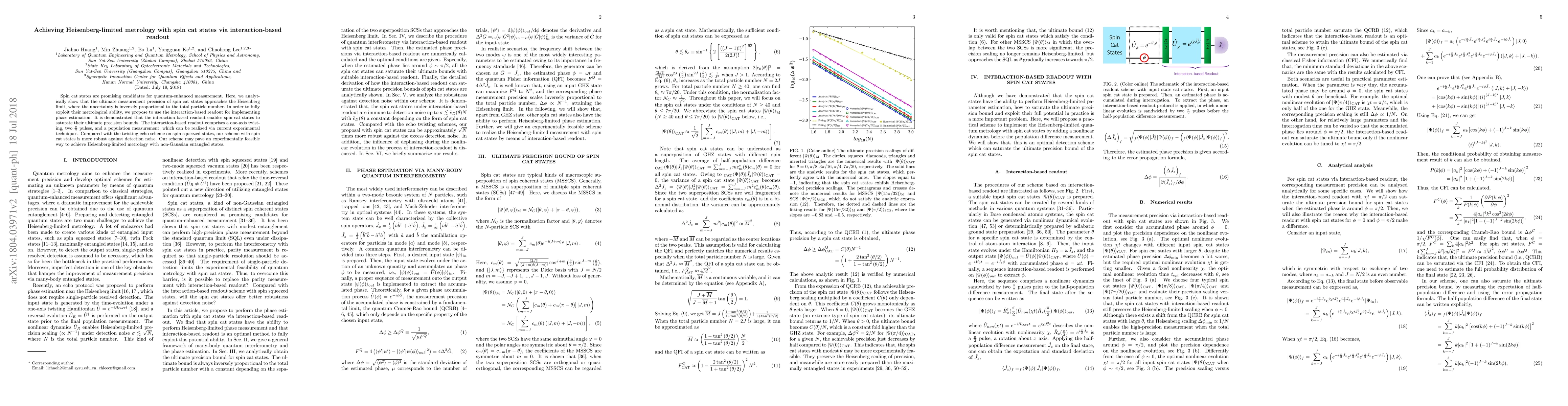 This paper demonstrates that spin cat states can achieve Heisenberg-limited metrology, where measurement precision is inversely proportional to the total particle number. The proposed interaction-based readout, involving one-axis twisting and $\frac{\pi}{2}$ pulses, enables spin cat states to reach their ultimate precision, outperforming the twisting echo scheme for spin squeezed states in robustness against detection noise.
