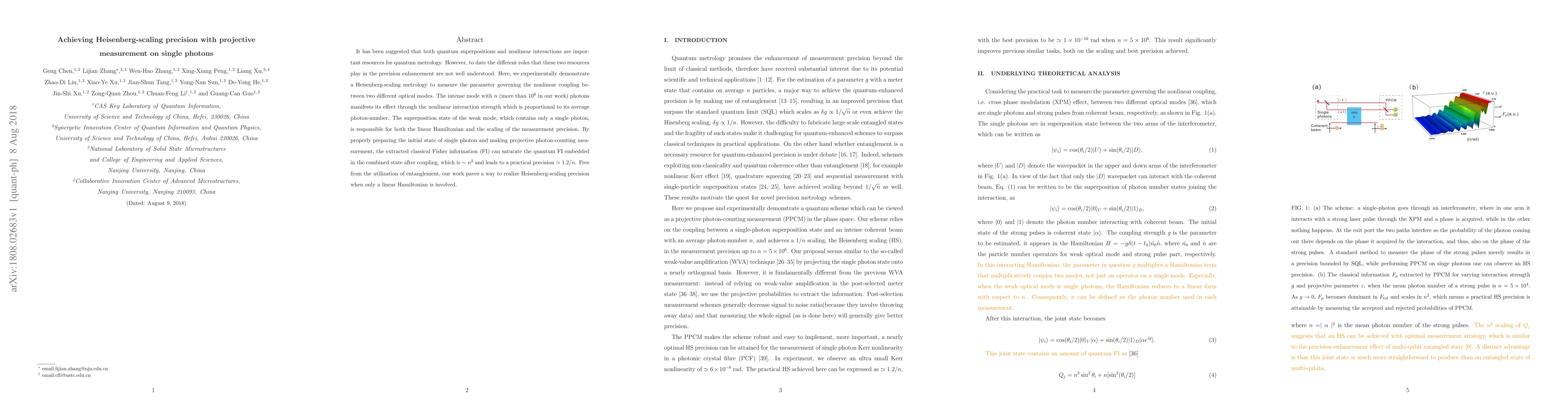 This research experimentally demonstrates Heisenberg-scaling precision in quantum metrology using projective measurement on single photons, showing that nonlinear interactions and superposition states can enhance measurement precision without requiring entanglement. The method achieves practical precision proportional to 1.2/n, where n is the photon number in the intense mode.