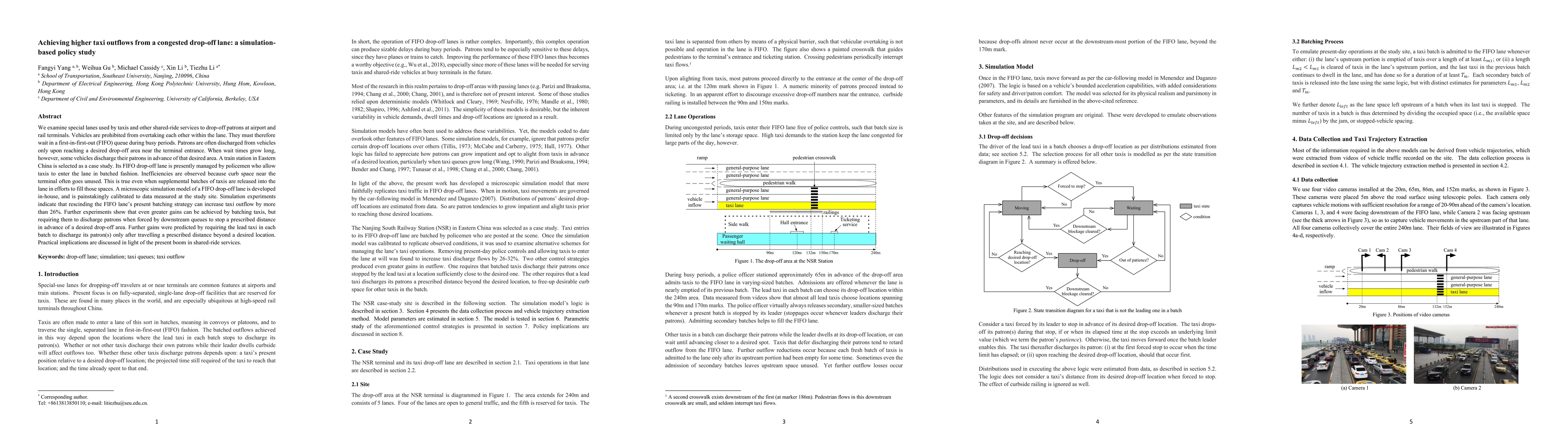 We examine special lanes used by taxis and other shared-ride services to drop-off patrons at airport and rail terminals. Vehicles are prohibited from overtaking each other within the lane. They must therefore wait in a first-in-first-out queue during busy periods. Patrons are often discharged from vehicles only upon reaching a desired drop-off area near the terminal entrance. When wait times grow long, however, some vehicles discharge their patrons in advance of that desired area. A train station in Eastern China is selected as a case study. Its FIFO drop-off lane is presently managed by policemen who allow taxis to enter the lane in batched fashion. Inefficiencies are observed because curb space near the terminal often goes unused. This is true even when supplemental batches of taxis are released into the lane in efforts to fill those spaces. A microscopic simulation model of a FIFO drop-off lane is developed in-house, and is painstakingly calibrated to data measured at the study site. Simulation experiments indicate that rescinding the FIFO lane's present batching strategy can increase taxi outflow by more than 26 percent. Further experiments show that even greater gains can be achieved by batching taxis, but requiring them to discharge patrons when forced by downstream queues to stop a prescribed distance in advance of a desired drop-off area. Further gains were predicted by requiring the lead taxi in each batch to discharge its patron only after travelling a prescribed distance beyond a desired location. Practical implications are discussed in light of the present boom in shared-ride services.
